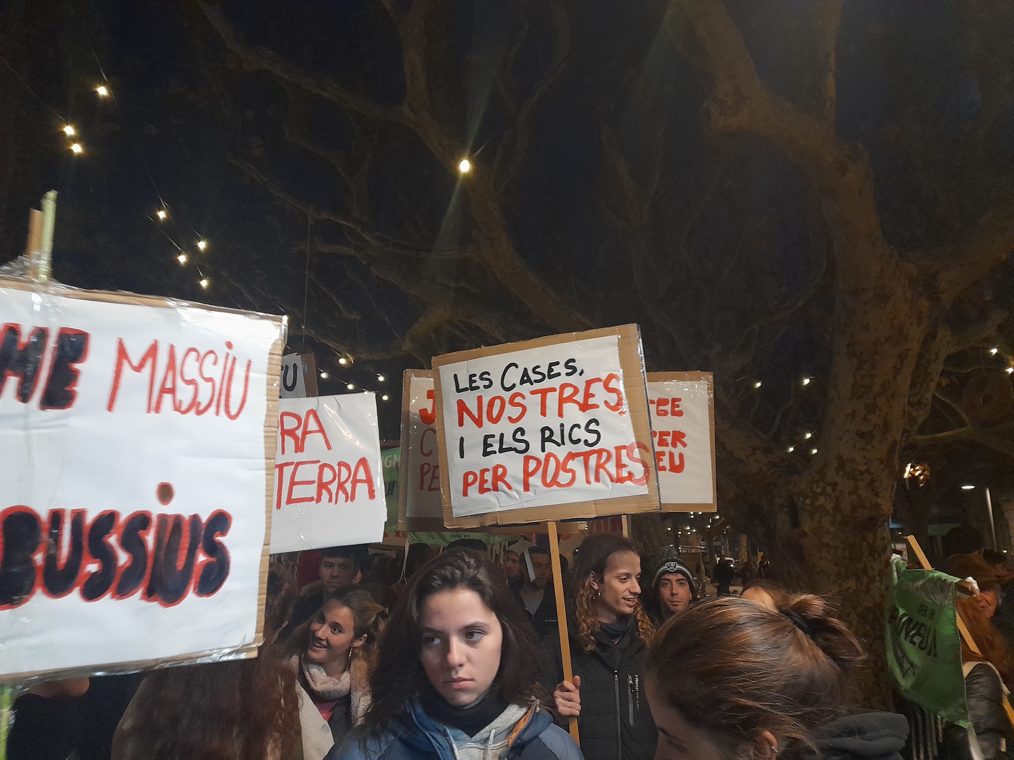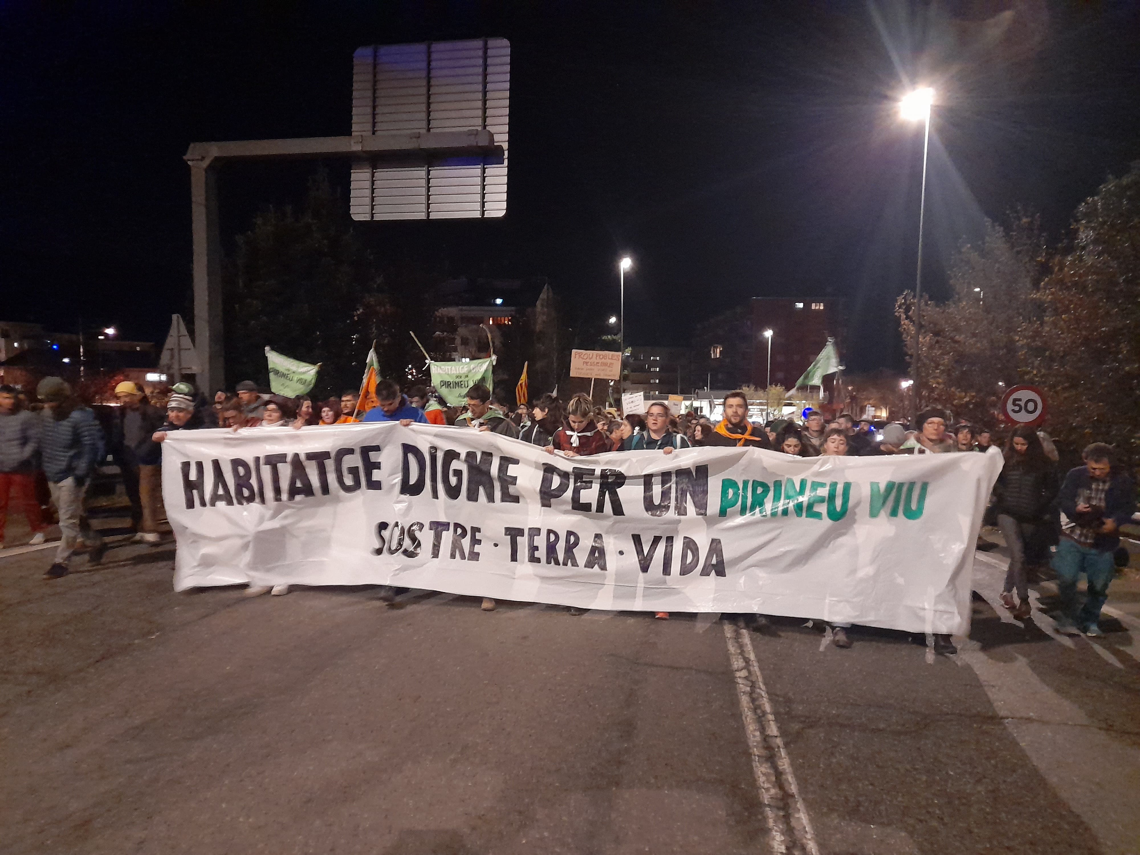 La marxa ha arrencat les 18.20 hores al passeig Joan Brudieu enmig d’un ambient reivindicatiu, però també festiu. En la pancarta que l’encapçalava s’hi podia llegir el missatge “Habitatge digne per un Pirineu viu: sostre, terra i vida”. Una batucada amenitzava la marxa que enfilava el carrer Sant Emerngol amb la presència també de dos gegants i bastoners. Una vegada a l’avinguda Salòria, tot i que s’havia deixat clar que no es tallaria cap carretera, la comitiva ha enfilat l’N-260 i ha tallat durant mitja hora els accessos a Andorra a l’encreuament amb l’N-145. Els manifestants s’han aturat enmig de la rotonda, mentre quatre tractors d’Unió de Pagesos s’han posat al costat.