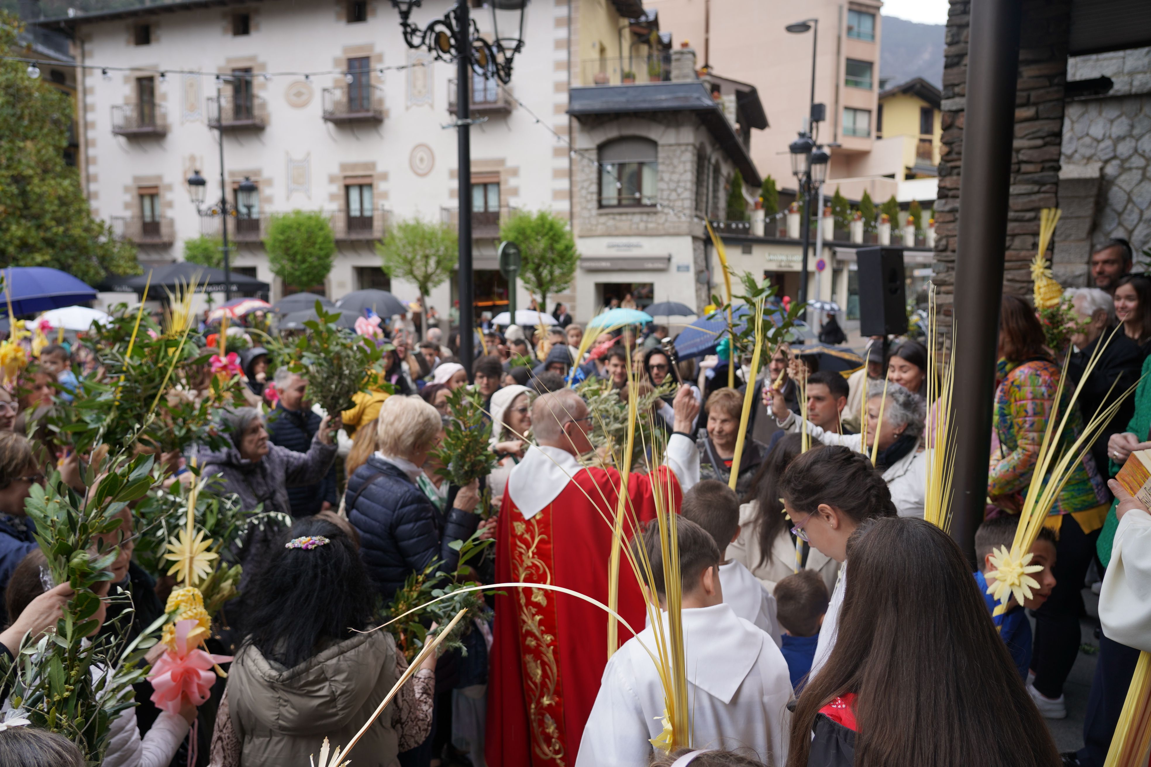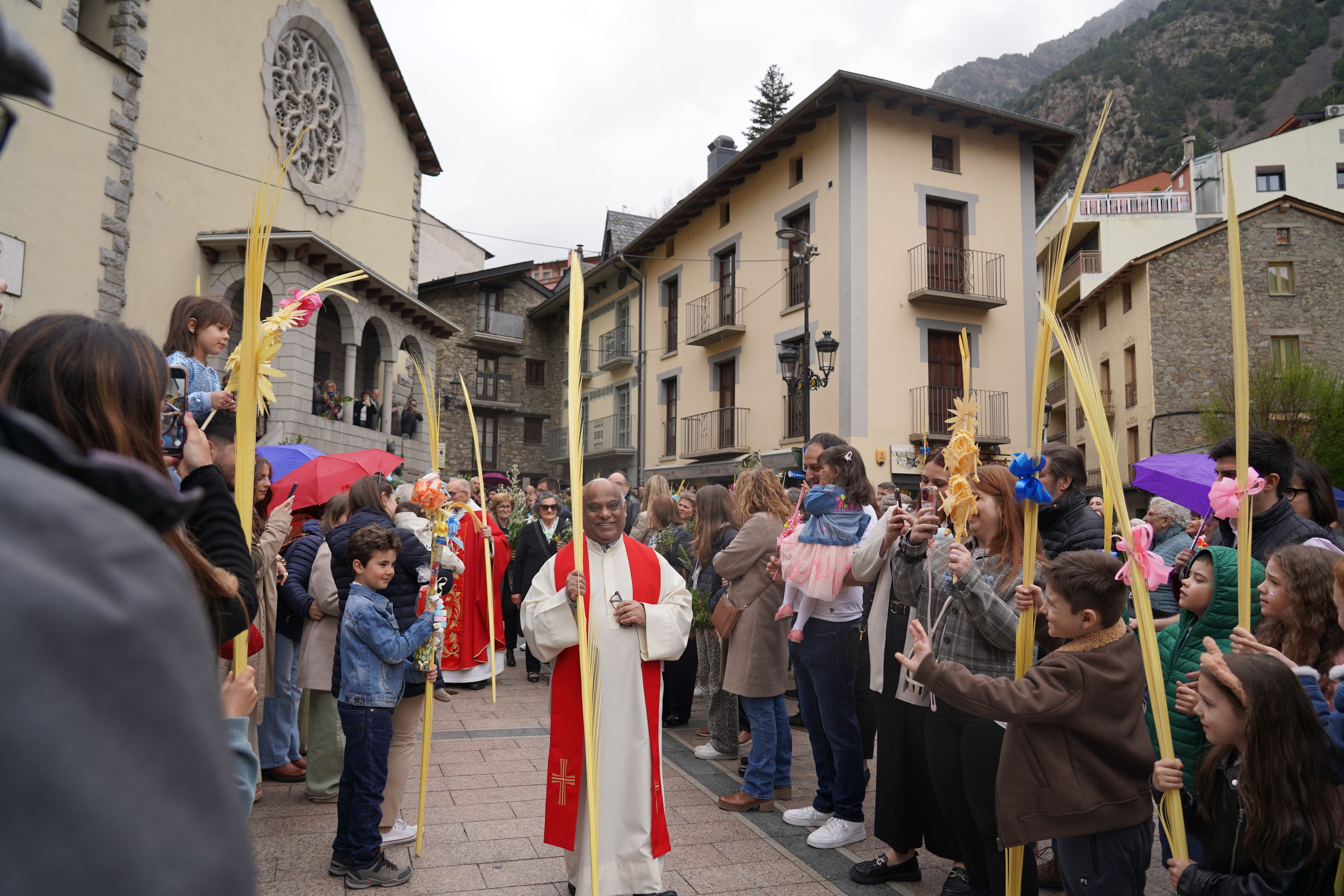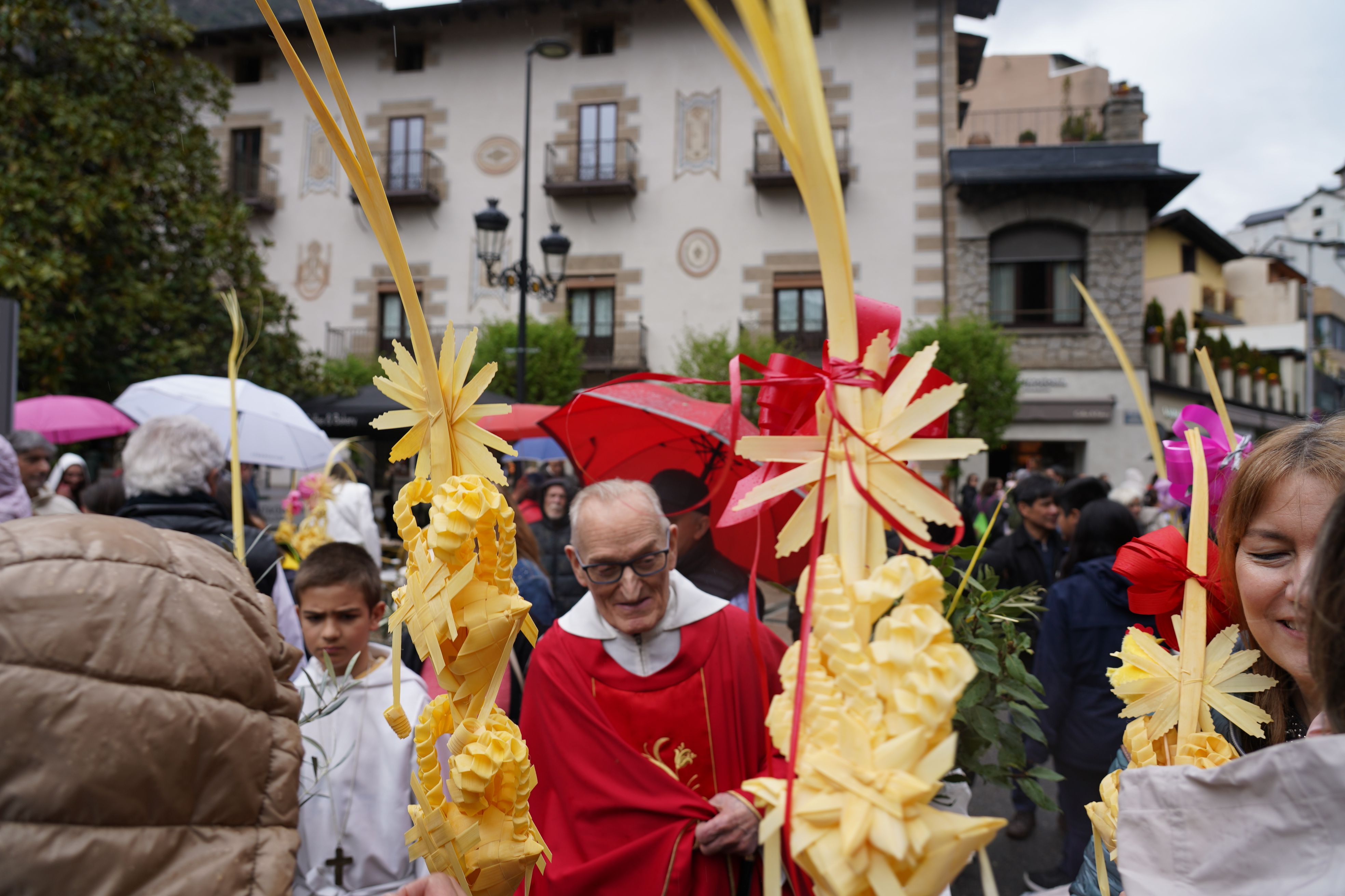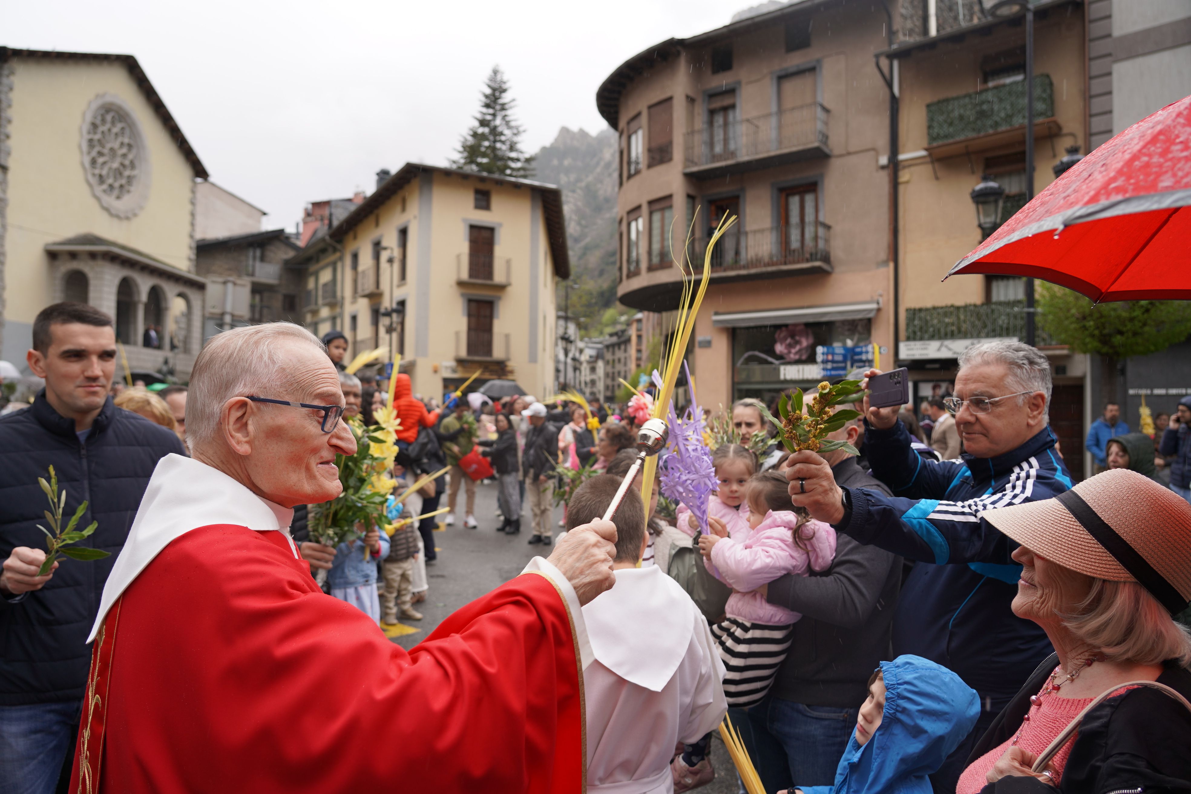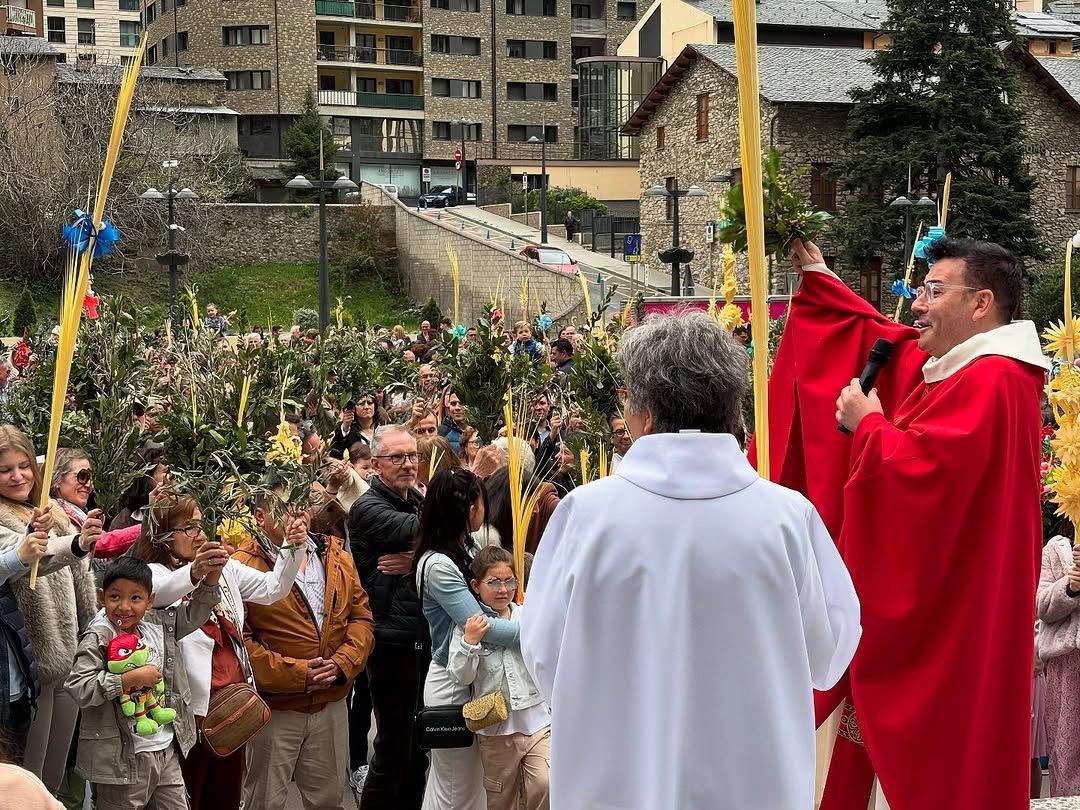 Els veïns de la parròquia, especialment els més petits, han aixecat ben amunt les seves palmes, palmons i branques de llorer i olivera que els han comprat els padrins mentre Sàrries ha iniciat la seva oració habitual. L’arxipreste de les Valls d’Andorra ha bromejat amb les quatre gotes que han començat a caure, recordant que és aigua beneïda, abans de fer, juntament amb mossèn Anto, la lectura de l’evangeli que recordava l’entrada de Jesús a la capital hebrea. Ha estat un text molt breu, probablement degut al temps, i quan els sacerdots han finalitzat, Sàrries s’ha fet un bany de masses entre els assistents, beneint-los la palma i el que fos necessari mentre els fidels s’anaven acostant per donar la benvinguda al moment més important de l’any litúrgic cristià.