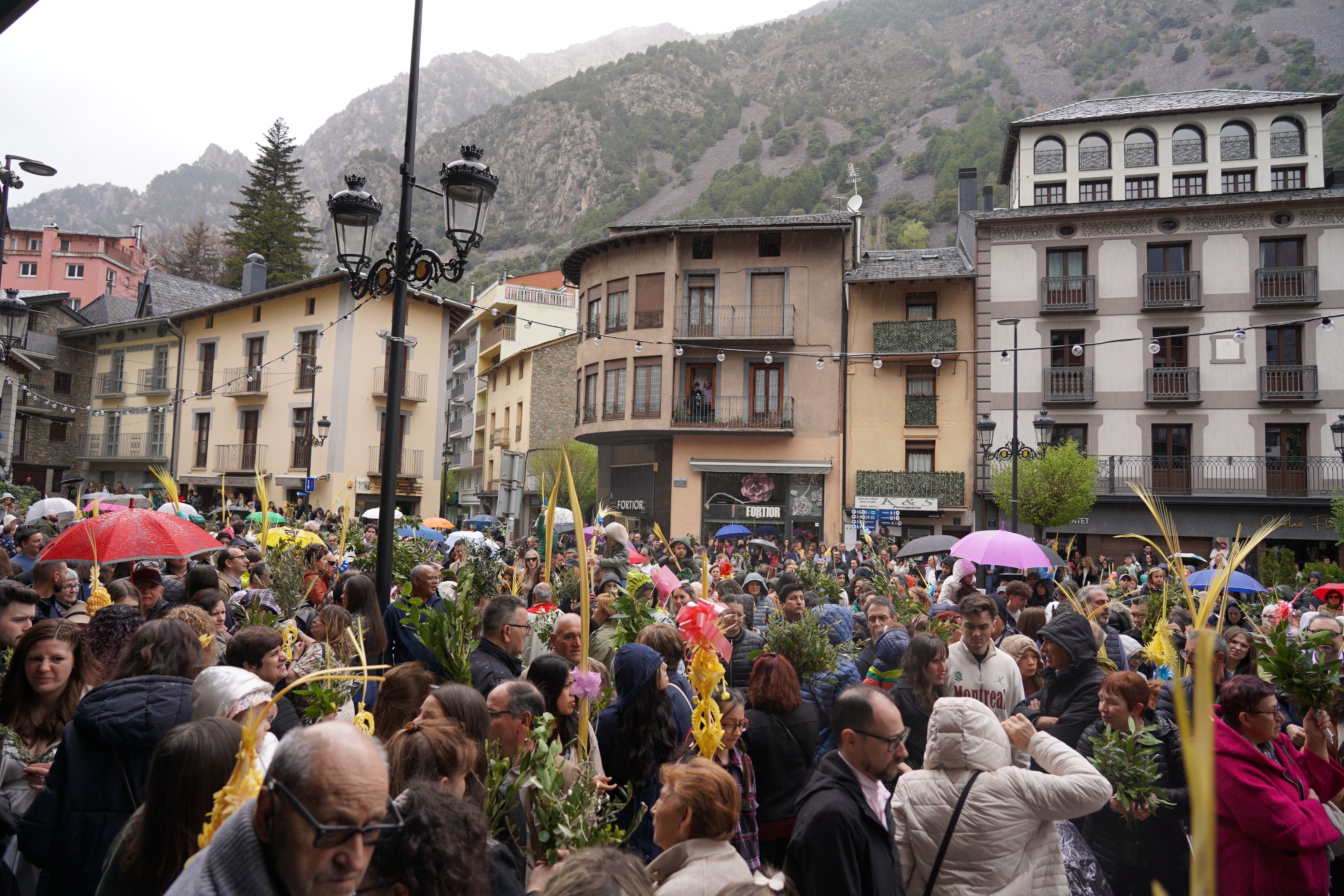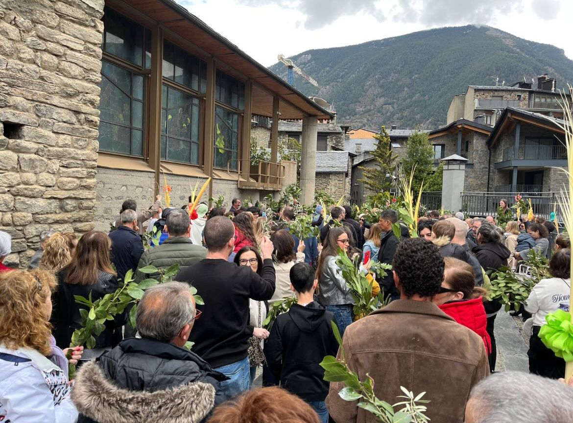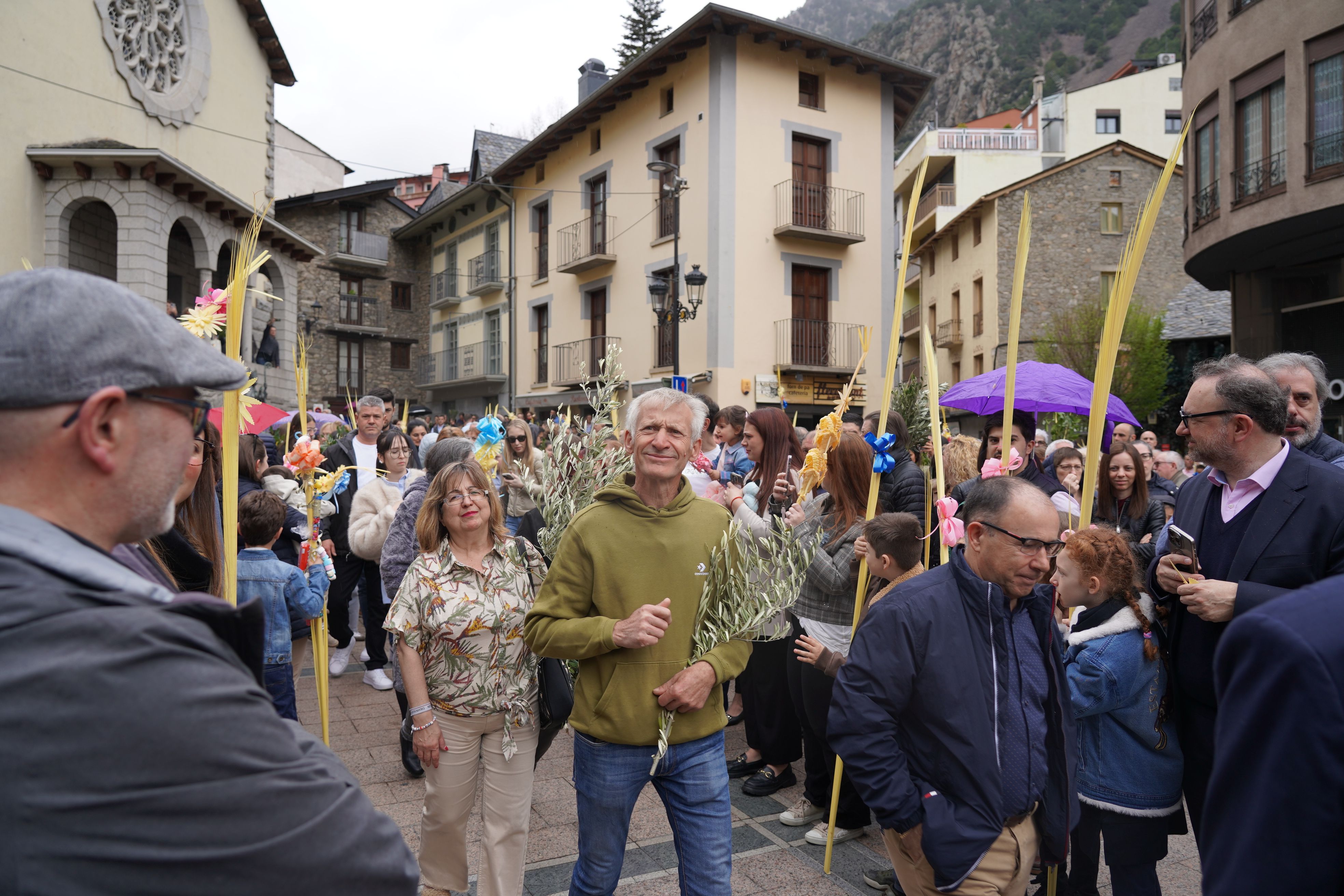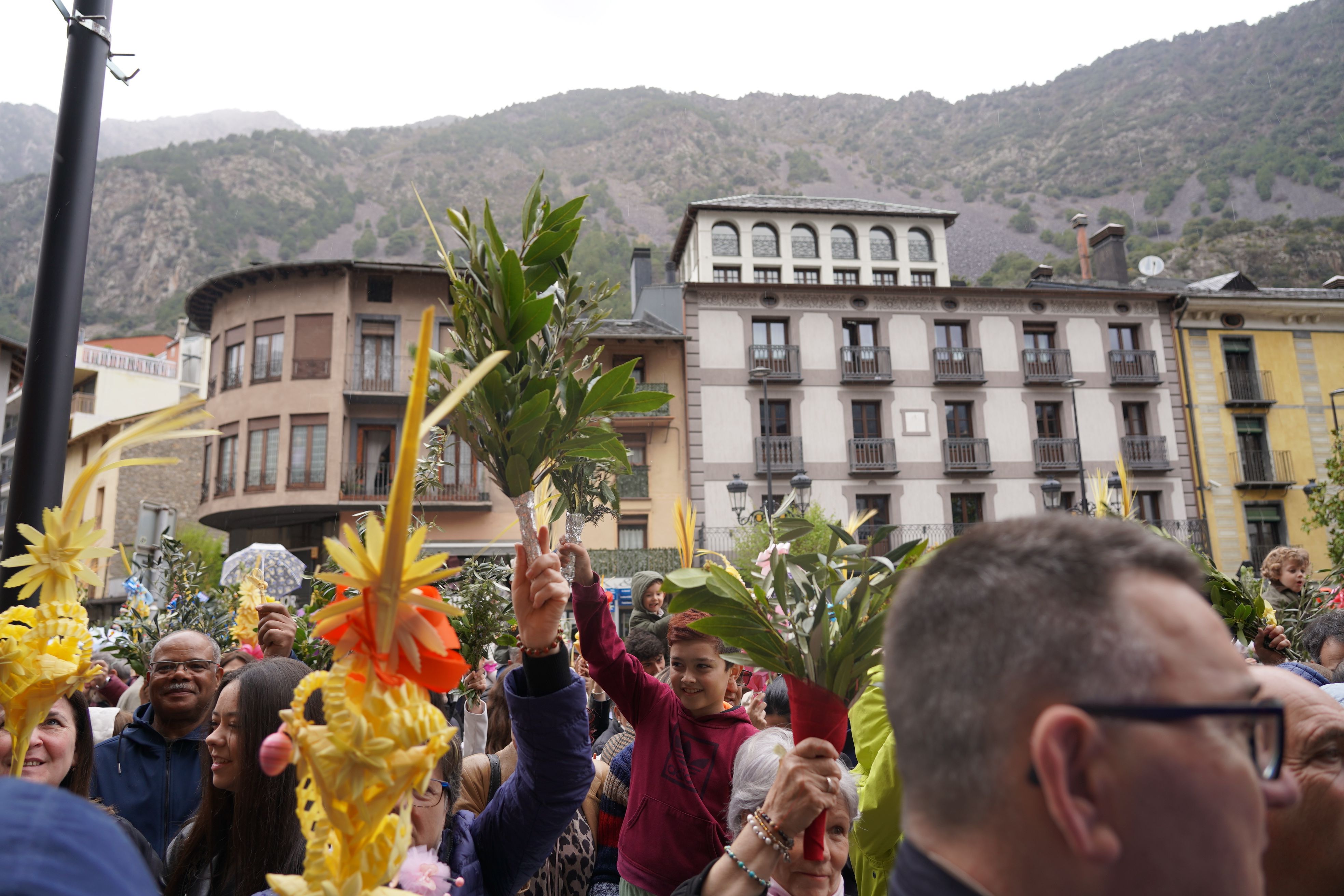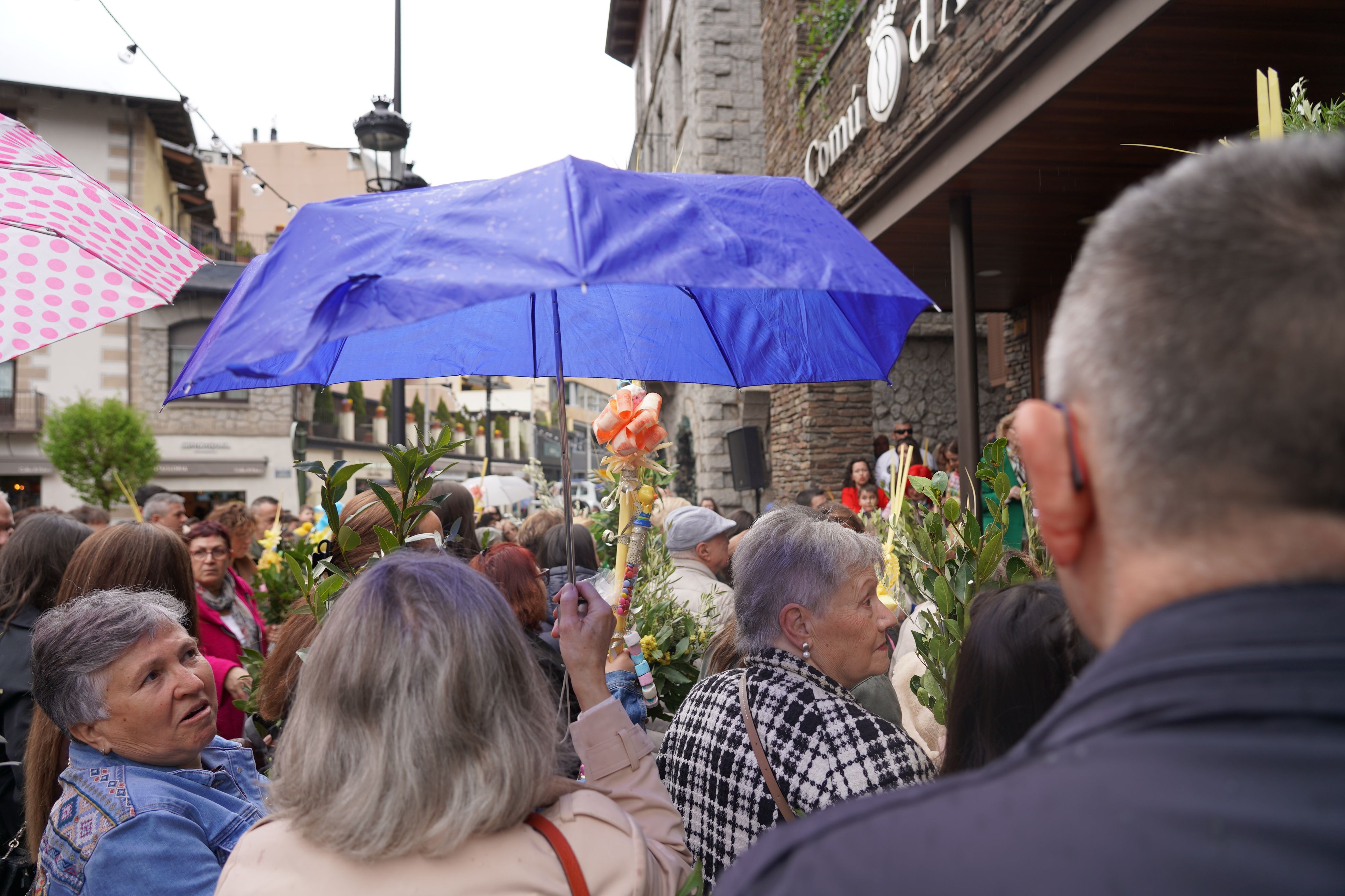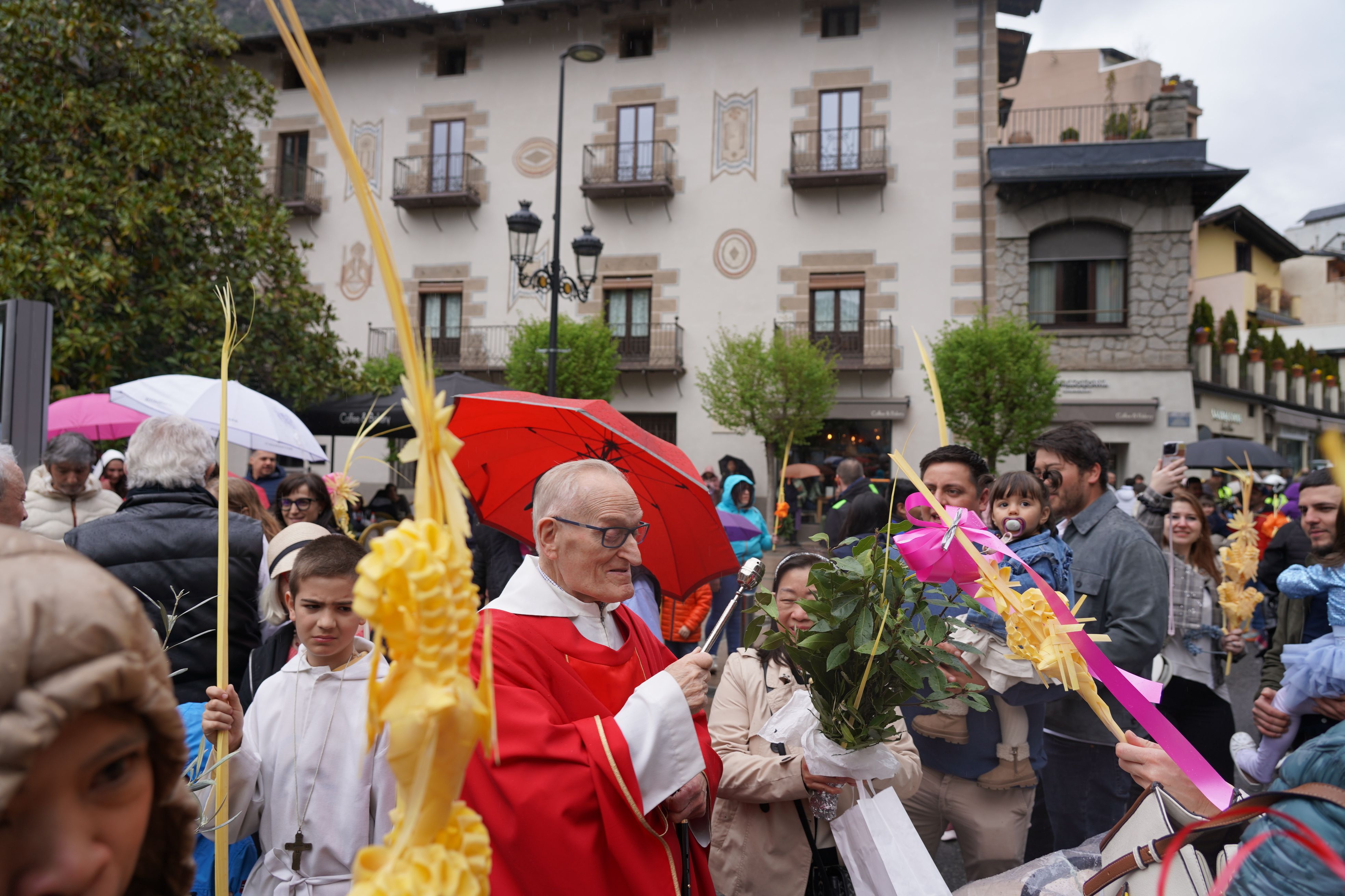 Els veïns de la parròquia, especialment els més petits, han aixecat ben amunt les seves palmes, palmons i branques de llorer i olivera que els han comprat els padrins mentre Sàrries ha iniciat la seva oració habitual. L’arxipreste de les Valls d’Andorra ha bromejat amb les quatre gotes que han començat a caure, recordant que és aigua beneïda, abans de fer, juntament amb mossèn Anto, la lectura de l’evangeli que recordava l’entrada de Jesús a la capital hebrea. Ha estat un text molt breu, probablement degut al temps, i quan els sacerdots han finalitzat, Sàrries s’ha fet un bany de masses entre els assistents, beneint-los la palma i el que fos necessari mentre els fidels s’anaven acostant per donar la benvinguda al moment més important de l’any litúrgic cristià.