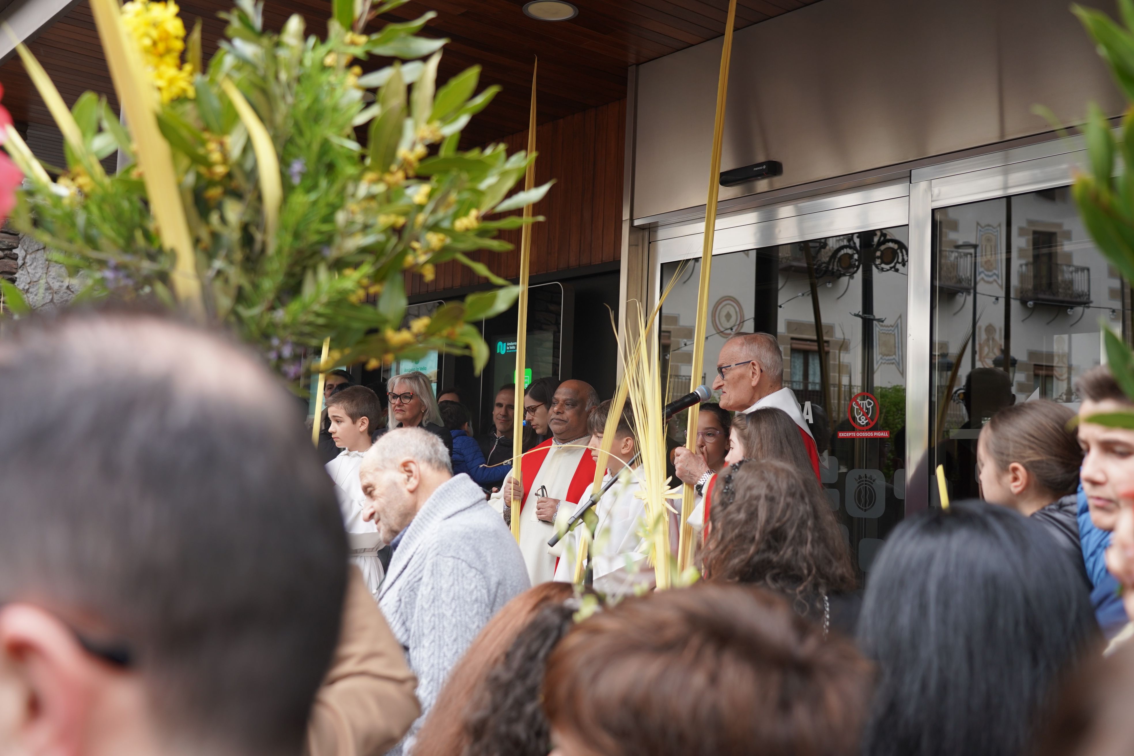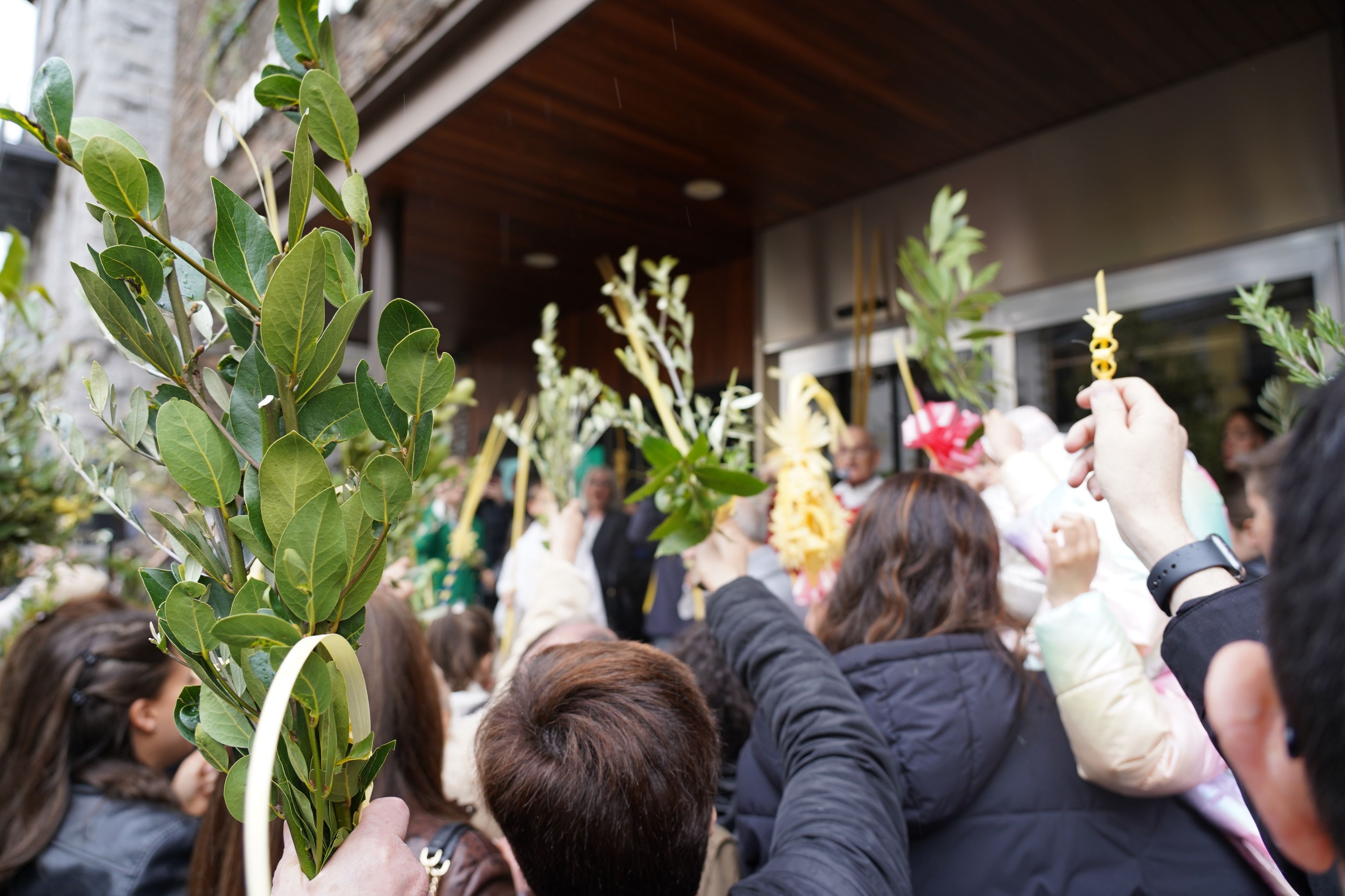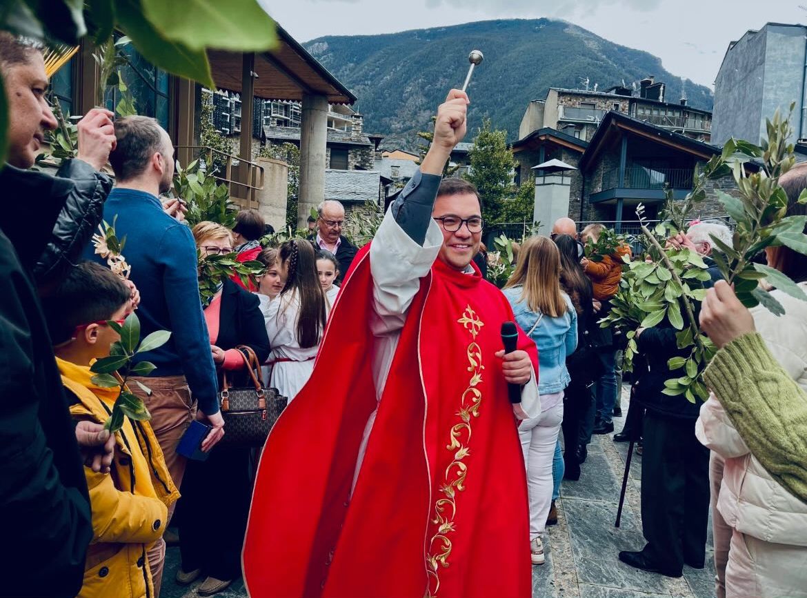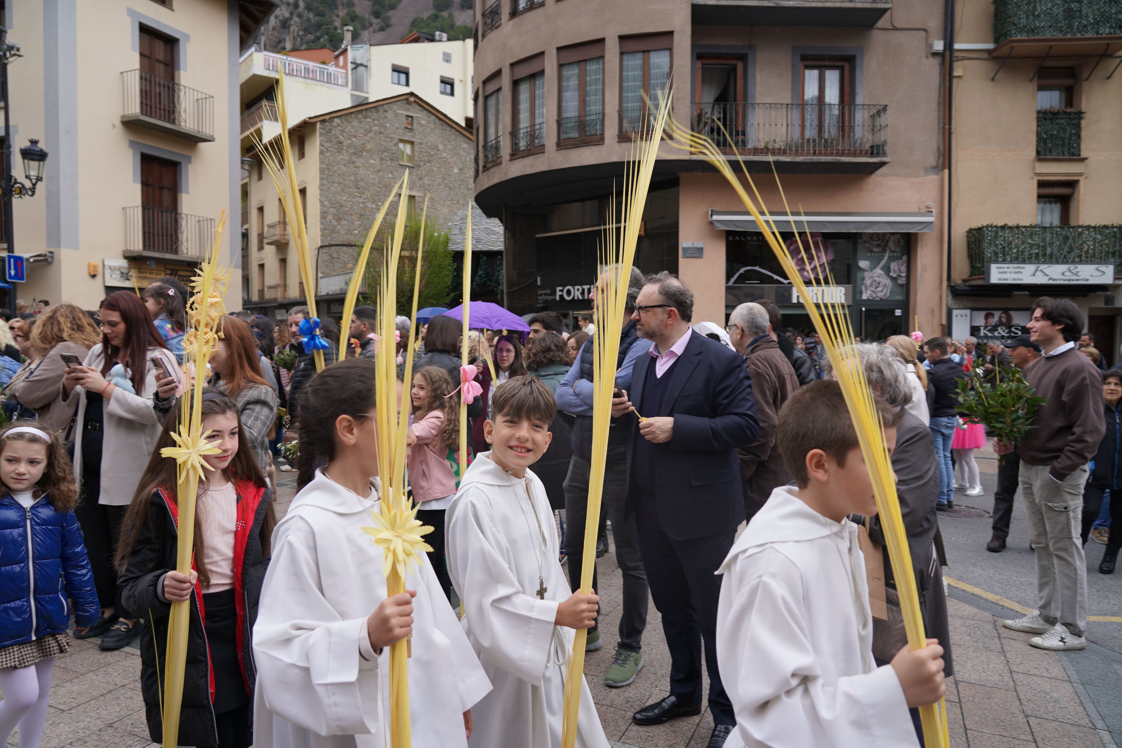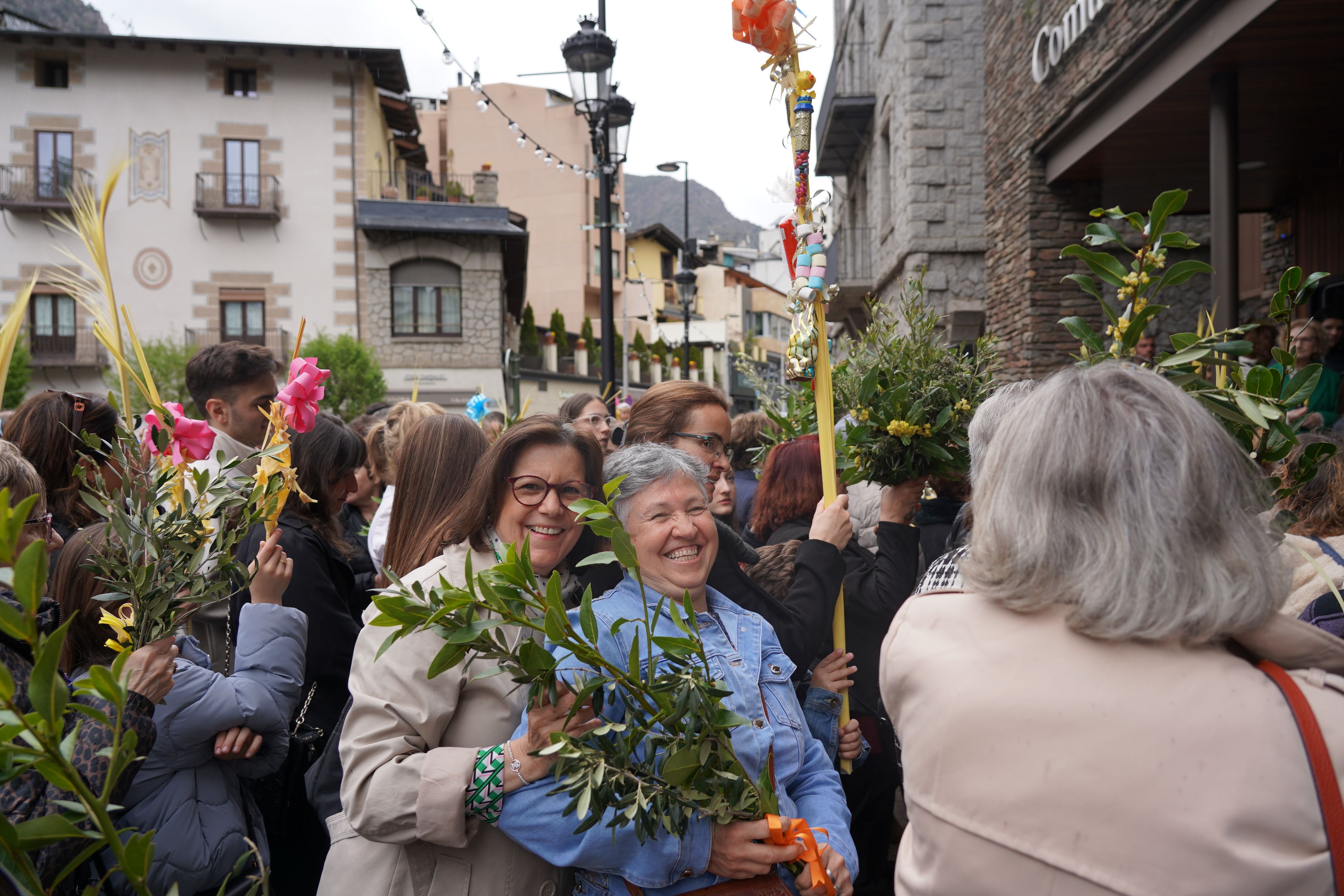 Els veïns de la parròquia, especialment els més petits, han aixecat ben amunt les seves palmes, palmons i branques de llorer i olivera que els han comprat els padrins mentre Sàrries ha iniciat la seva oració habitual. L’arxipreste de les Valls d’Andorra ha bromejat amb les quatre gotes que han començat a caure, recordant que és aigua beneïda, abans de fer, juntament amb mossèn Anto, la lectura de l’evangeli que recordava l’entrada de Jesús a la capital hebrea. Ha estat un text molt breu, probablement degut al temps, i quan els sacerdots han finalitzat, Sàrries s’ha fet un bany de masses entre els assistents, beneint-los la palma i el que fos necessari mentre els fidels s’anaven acostant per donar la benvinguda al moment més important de l’any litúrgic cristià.