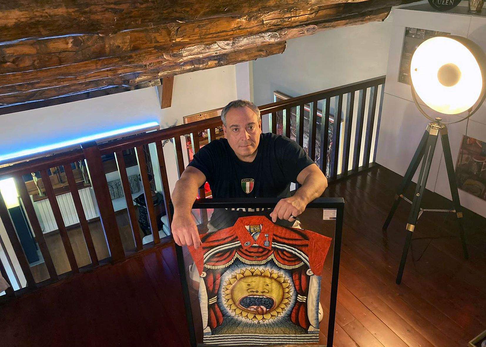 Germán Villalonga amb la guitarra de Brian May que acaba de rebre davant d'altres peces que col·lecciona de Queen.