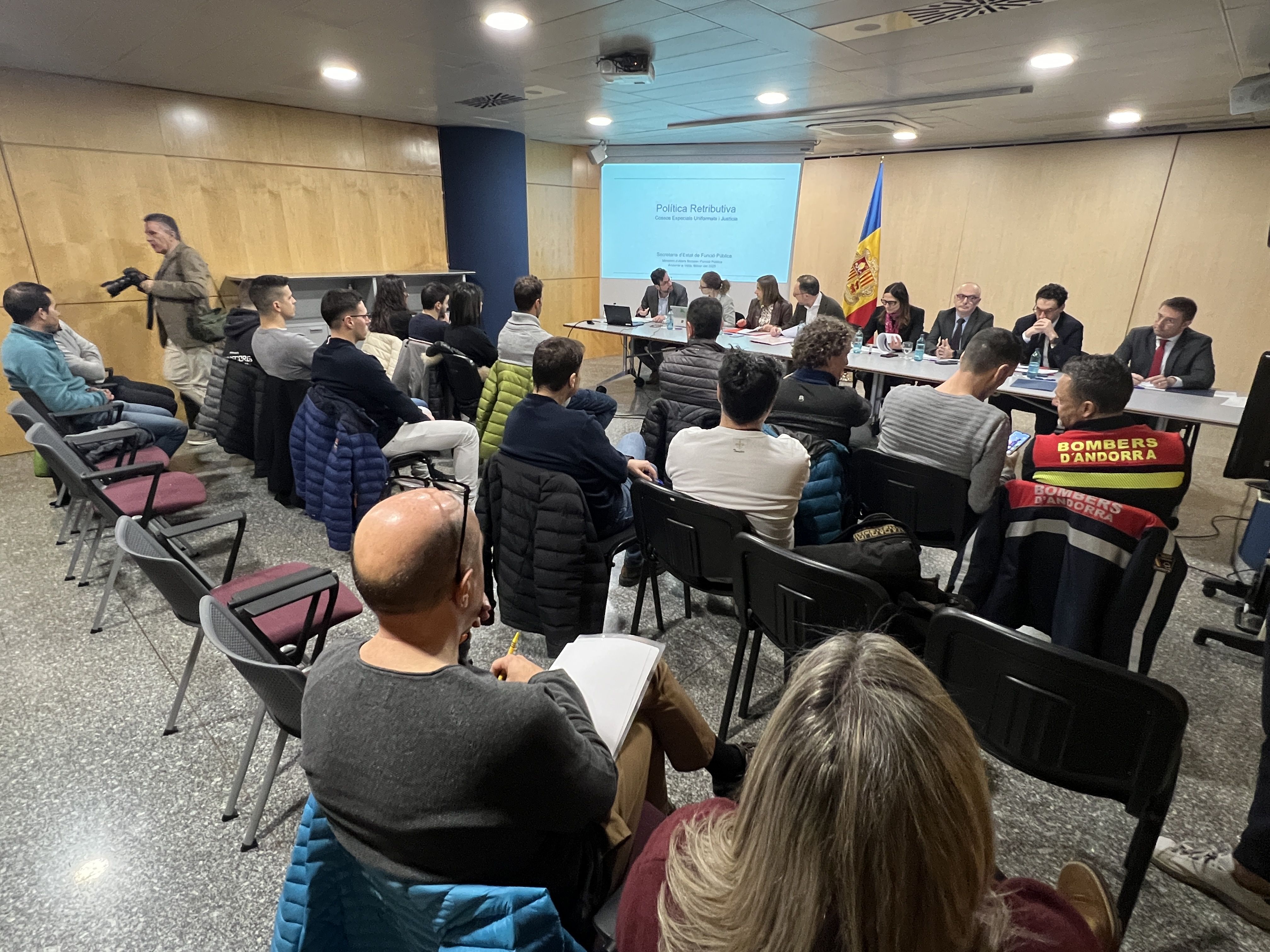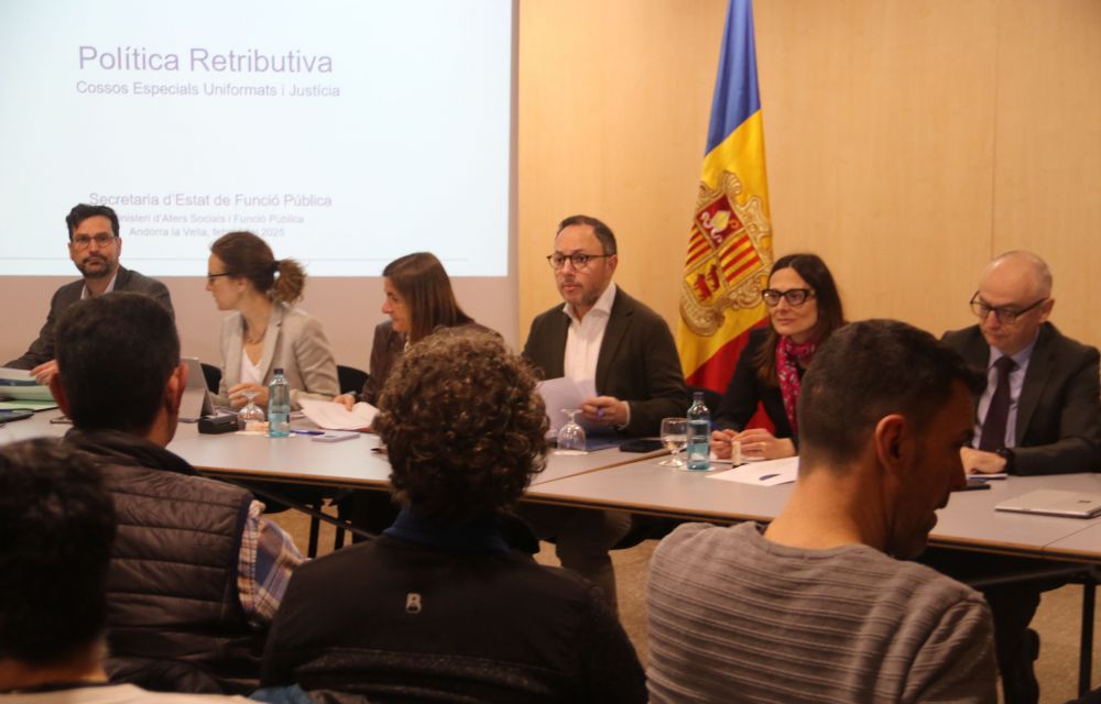 El màxim responsable governamental ha liderat la trobada que han mantingut diversos representants governamentals amb més d’una vintena de representants sindicals dels cossos especials uniformats i de l’administració de Justícia. La reunió ha servit de manera general per exposar la política retributiva que pretén aplicar l’executiu després de l’anàlisi efectuada els darrers mesos per una consultora externa sobre la graella salarial. La trobada s’ha celebrat enmig d’un clima d’elevada tensió malgrat que en sortir de la reunió el propi Espot ha assegurat que el nivell de conflictivitat no és tan elevat com sembla.