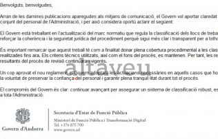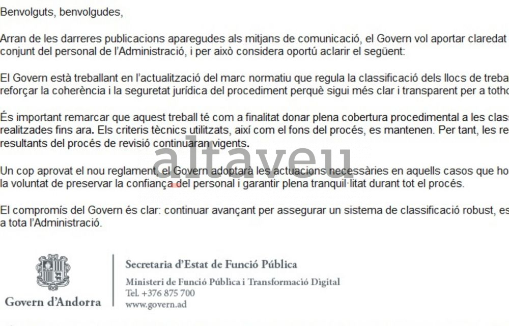 En tot cas, en la comunicació tramesa s’explica que “el Govern està treballant en l’actualització del marc normatiu que regula la classificació dels llocs de treball”. En aquest sentit, “l’objectiu és reforçar la coherència i la seguretat jurídica del procediment perquè sigui més clar i transparent per a tothom”. Per a la secretaria de Marc Cornella també “és important remarcar que aquest treball té com a finalitat donar plena cobertura procedimental a les classificacions realitzades fins ara”. I així, “els criteris tècnics utilitzats, així com el fons del procés, es mantenen. Per tant, les reclassificacions resultants del procês de revisió continuaran vigents”.