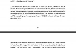 També es deixa clar que, “igualment, durant el mateix exercici, les retribucions dels membres del Consell Superior de la Justícia, dels magistrats, dels batlles, del fiscal general, dels fiscals adjunts, del president del Tribunal de Corts i del president del Tribunal Superior s’incrementen l’exercici del 2023 en funció de l’IPC”. L’increment salarial dels comandaments polítics, per dir-ho així, es fixa legalment abans, fins i tot, que els de la resta de treballadors de l’administració, que si no hi ha canvis també serà al 2023 en funció de l’IPC.