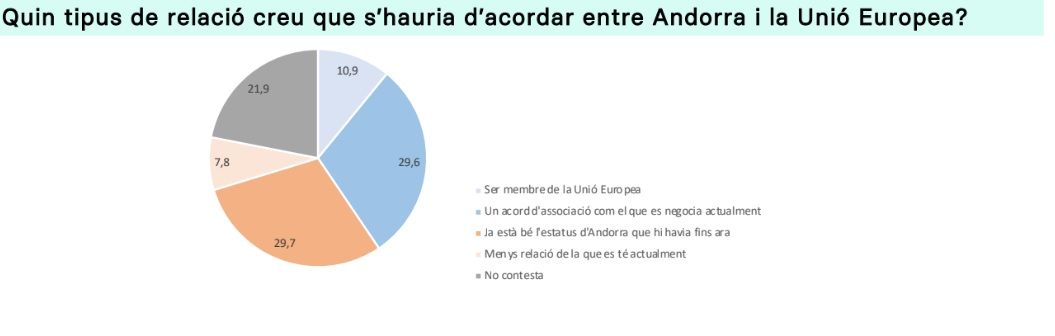 El treball de camp es va fer entre el 6 i el 21 de novembre i tres de cada deu enquestats (29,7%) assegura que ja li està bé l’estatus actual que té Andorra, mentre que el 29,6% està a favor d’un acord com el que s’està negociant. Prop d’un 11% li agradaria que el Principat fos membre de ple dret de la Unió Europea, mentre que el 7,8% dels enquestats volen tenir menys relació que la que es té actualment. Si ho comparem amb el 2022, es pot veure com cau el suport als que hi estan a favor. En el cas dels andorrans, l'any passat el 46,2% hi estaven a favor, mentre que un any després, el percentatge és del 30,8%, mentre que els que no volen canvis passen del 28,6 al 37%.