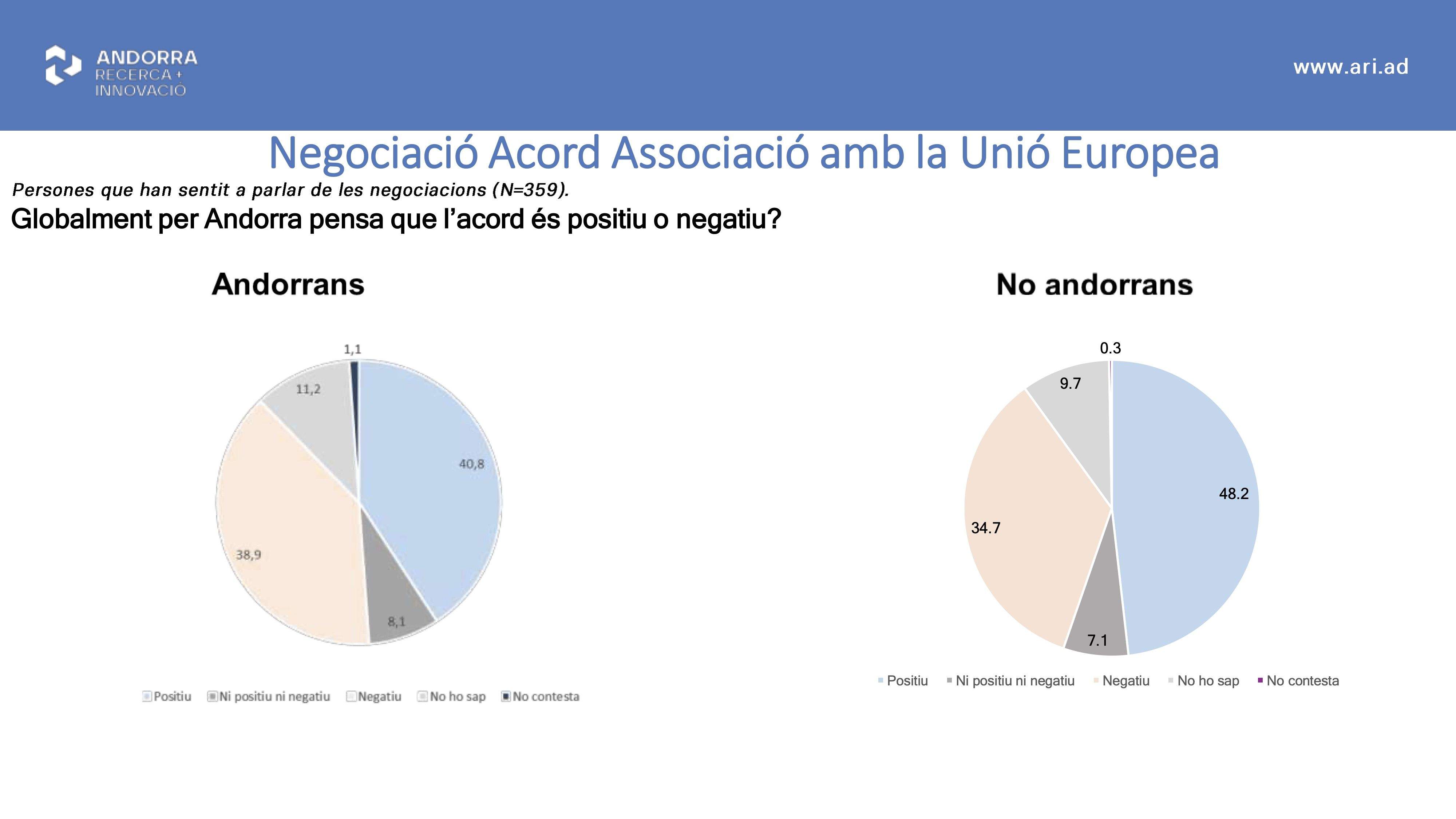 En fi, quan es demana als andorrans consultats en el marc de l’enquesta si es pensa que l’acord serà positiu o si serà negatiu hi ha una mena d’empat tècnic. El 40,8% considera que seria bo mentre que el 38,9 creu que seria negatiu. Entre la resta de ciutadans del país la percepció de la positivitat del tracte amb la UE és major (48,2% per 34,7%). Si la pregunta és quin tipus de relació hi hauria d’haver entre Brussel·les i Andorra, tant els nacionals com els que no ho són tenen clar que seria millor mantenir els acords actuals amb la UE (35,3% entre els andorrans) que no pas l’acord d’associació negociat (26,4%). Els percentatges, almenys quant a les diferències, no disten gaire si s’agafen les dades dels no nacionals.
