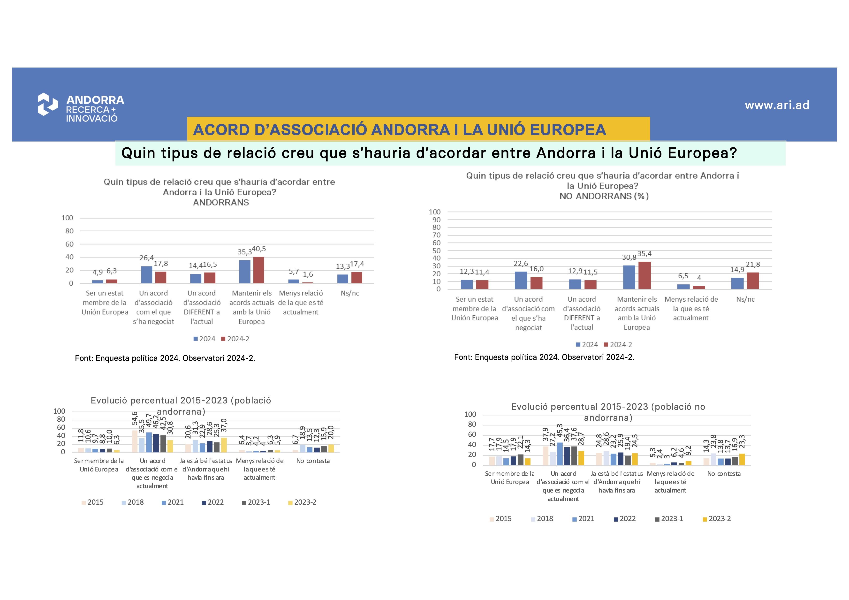 També és important l’anàlisi que fa l’Observatori en relació amb les fórmules de relació amb la Unió Europea. En aquest sentit, entre els nacionals andorrans ha baixat com a sistema d’embrancament amb Europa l’acord que s’ha negociat i, en canvi, ha pujat de manera molt significativa els que consideren que s’haurien de mantenir els actuals acords. Aquesta radiografia es dona igual també entre els residents no nacionals. La diferència més significativa està entre aquells que apostarien per un acord diferent del que s’ha negociat. Els andorrans ho veuen millor, tot i no ser l’escenari principal, que no pas els residents.
