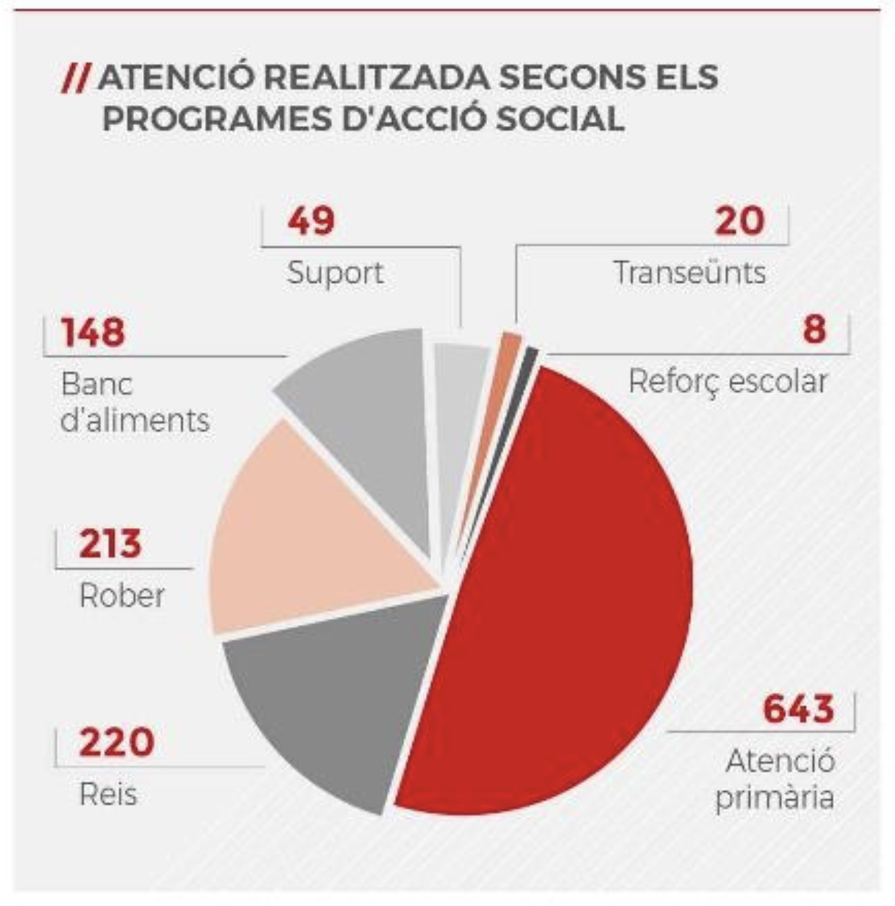 En total, durant l’any 2022 l’entitat va destinar 504.075,68 euros als diferents programes d’acció social que té en marxa amb la voluntat d’atendre, acompanyar i donar suport a les persones vulnerables. Entre els programes socials més destacats: el d’atenció primària amb 119.545,02 euros i el banc d’aliments amb 61.667,54 euros són els que concentren bona part de les ajudes realitzades.