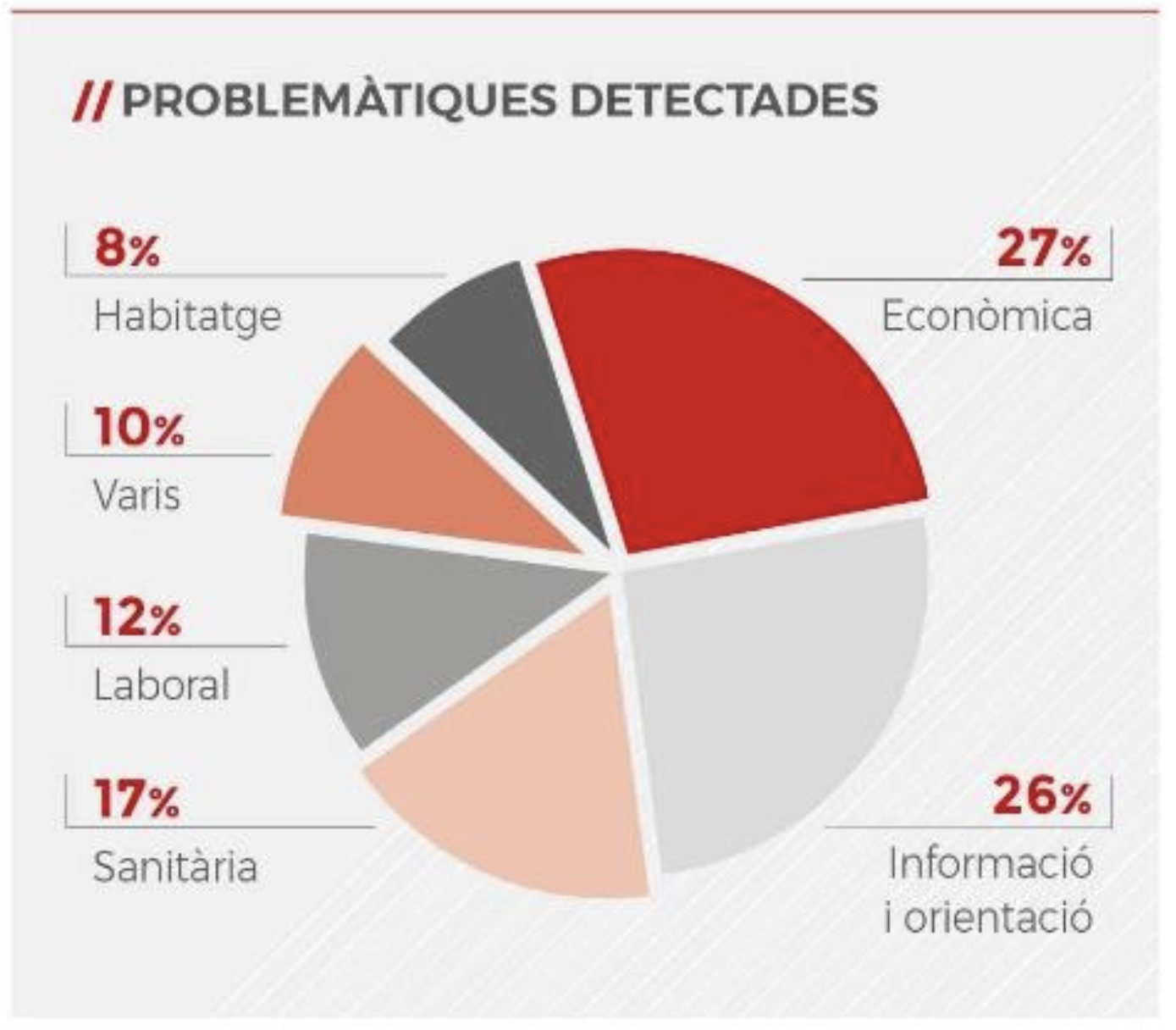 Del total d’intervencions, un 52% es van centrar en acompanyar, escoltar i orientar de forma personal; un 18% corresponen a oferir pautes educatives a fills, casos de maltractaments, dol i addiccions; un 11% suport en casos de malaltia; un 11% acompanyament per aïllament i desarrelament i un 8% per depressions.
