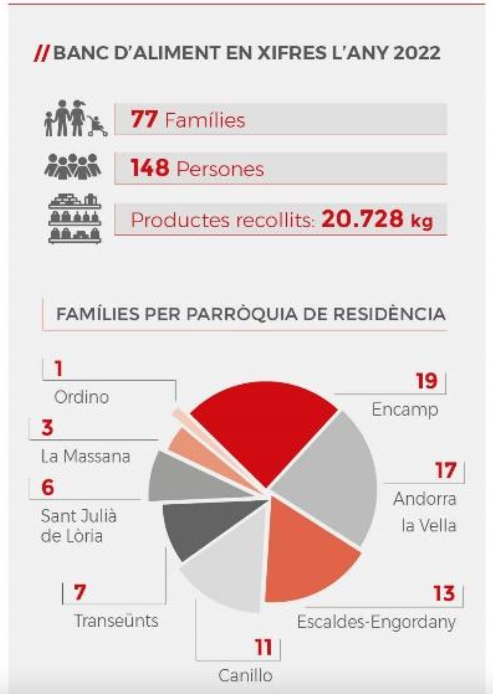 Per nacionalitats, un 20% de les famílies ateses són espanyoles, un 19% andorranes, un 16% portugueses, un 16% ucraïneses, un 15% sud- americanes i la resta, són d’altres nacionalitats. Del total de famílies ateses, un 60% van rebre ajuda per primera vegada. D’entre aquestes famílies es van manifestar un total de 1.074 problemàtiques, unes xifres similars a l’any anterior. En concret, un 27% eren problemes econòmics, un 26% eren demandes d’informació i orientació, un 17% temes sanitaris, un 12% sobre qüestions laborals, un 8% sobre habitatge i la resta eren altres problemàtiques.