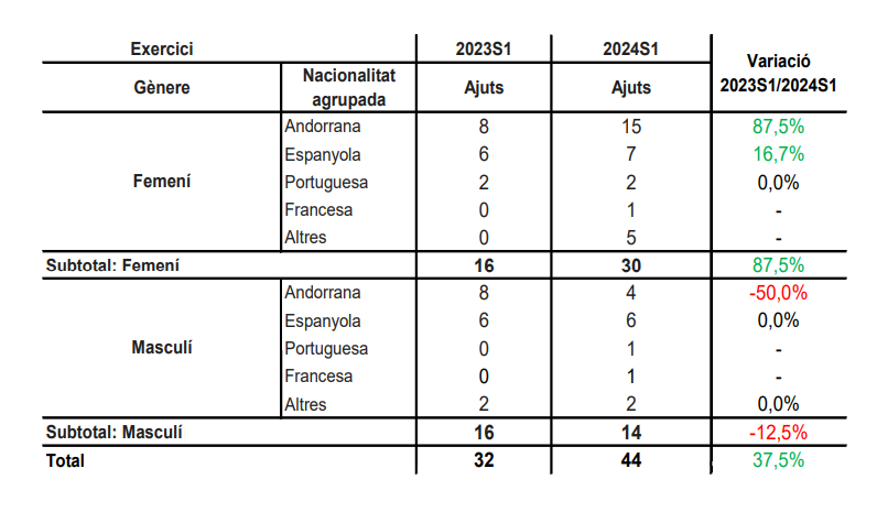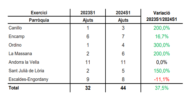 Segons les dades dels registres del Departament d’Afers Socials, el nombre de sol·licituds de prestacions socials per atur presentades durant el primer semestre del 2024 ha estat de 64, un 28% més que al primer semestre del 2023. El 68,8% han estat resoltes favorablement (44) i un 31,3% han estat resoltes desfavorablement (20). Per tant, les que s’han aprovat han crescut un 37,5%, ja que des del gener fins al juny de l’any passat només havien estat 32.