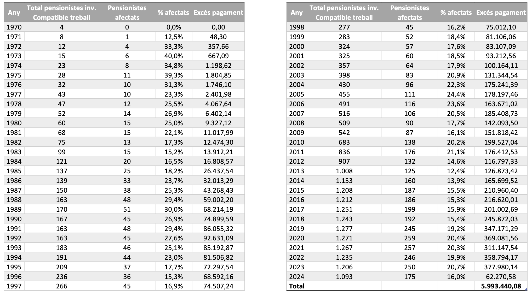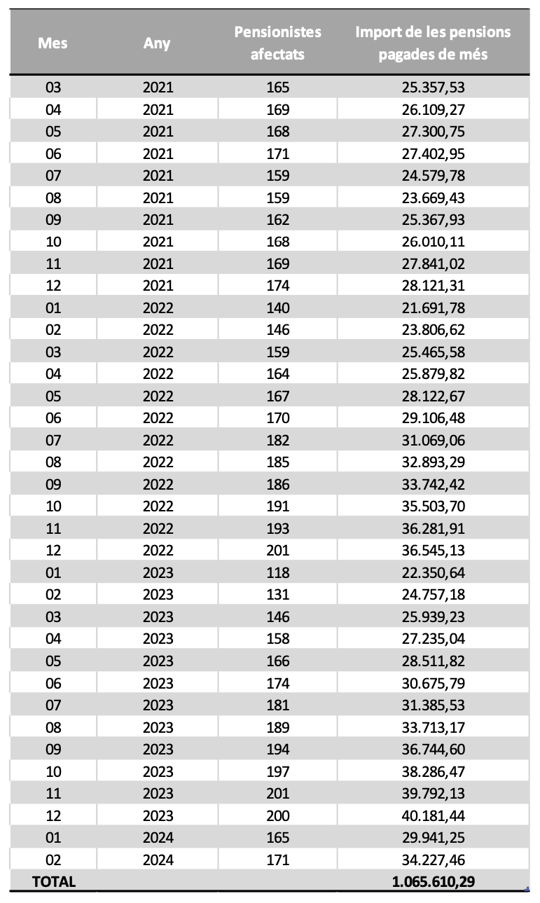 Un element clau es dona el 2021. No se sap perquè, o almenys no s’ha aclarit en el marc del forensic, aquell any es va posar una tècnica de l’àrea de pensions que feia teletreball a revisar pensions d’invalidesa parcial. En una setmana en va analitzar de forma manual 525 pensions -de les 638 que es pagaven llavors- i es va arribar a la conclusió que en 105 es pagava més del tocava. Per tant, en el 20% dels casos s’estaven fent abonaments indeguts. I es van suspendre 34 d’aquelles prestacions. Mai es van reclamar, mai, els imports pagats de més.