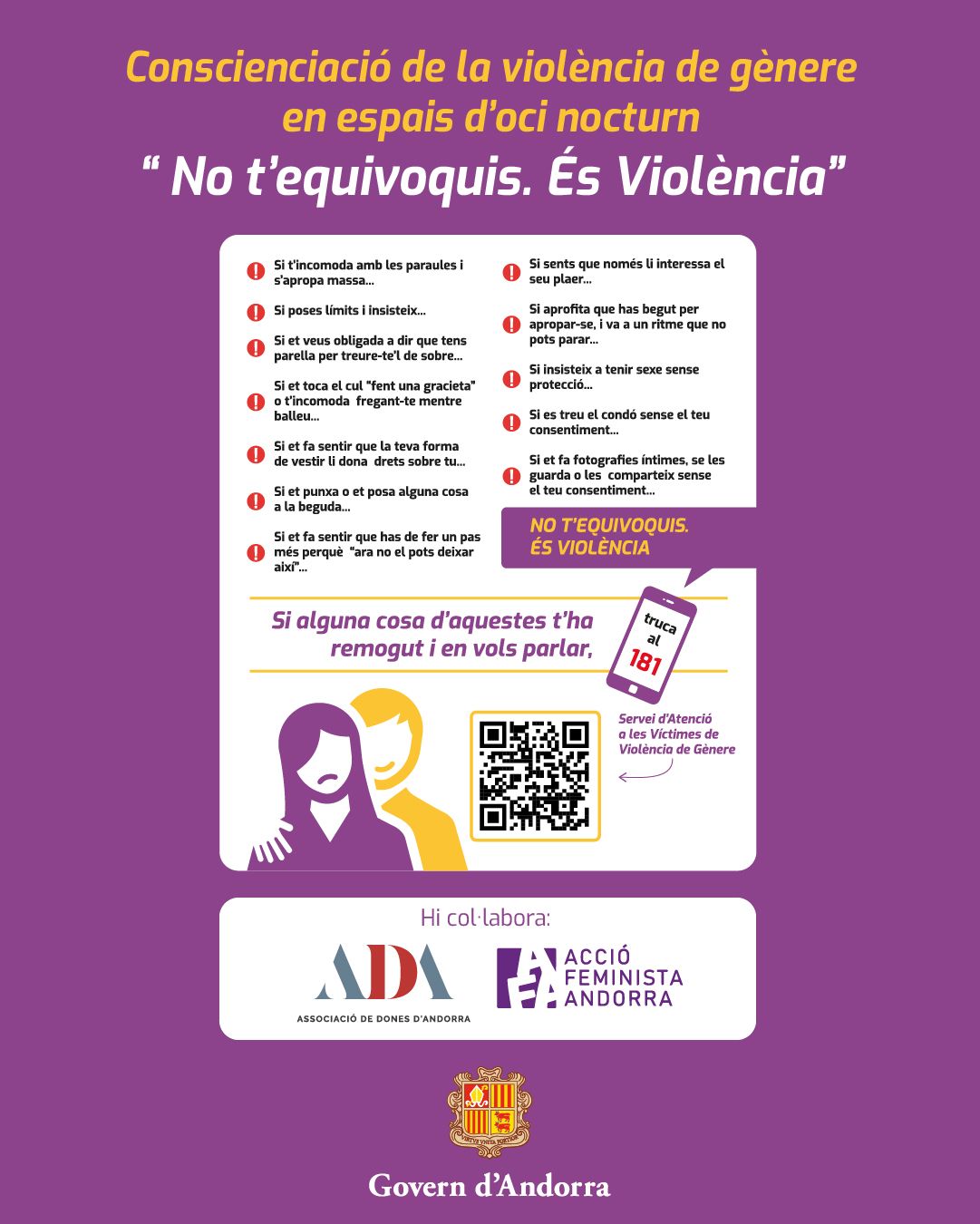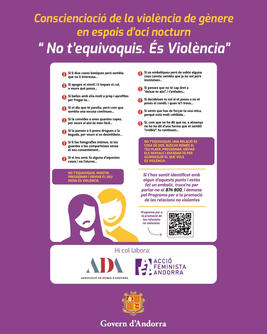Mitjançant adhesius, que ja s’han començat a repartir als diferents locals, es traslladen diferents situacions que comporten un abús i que, en certa manera, estan normalitzats per molts joves. L’eslògan escollit és ‘No t’equivoquis. És violència’. A més, s’inclouen dos QR que porten un al programa per a la promoció de les relacions no violentes i l’altre al servei d’Atenció a les víctimes de violència de gènere.