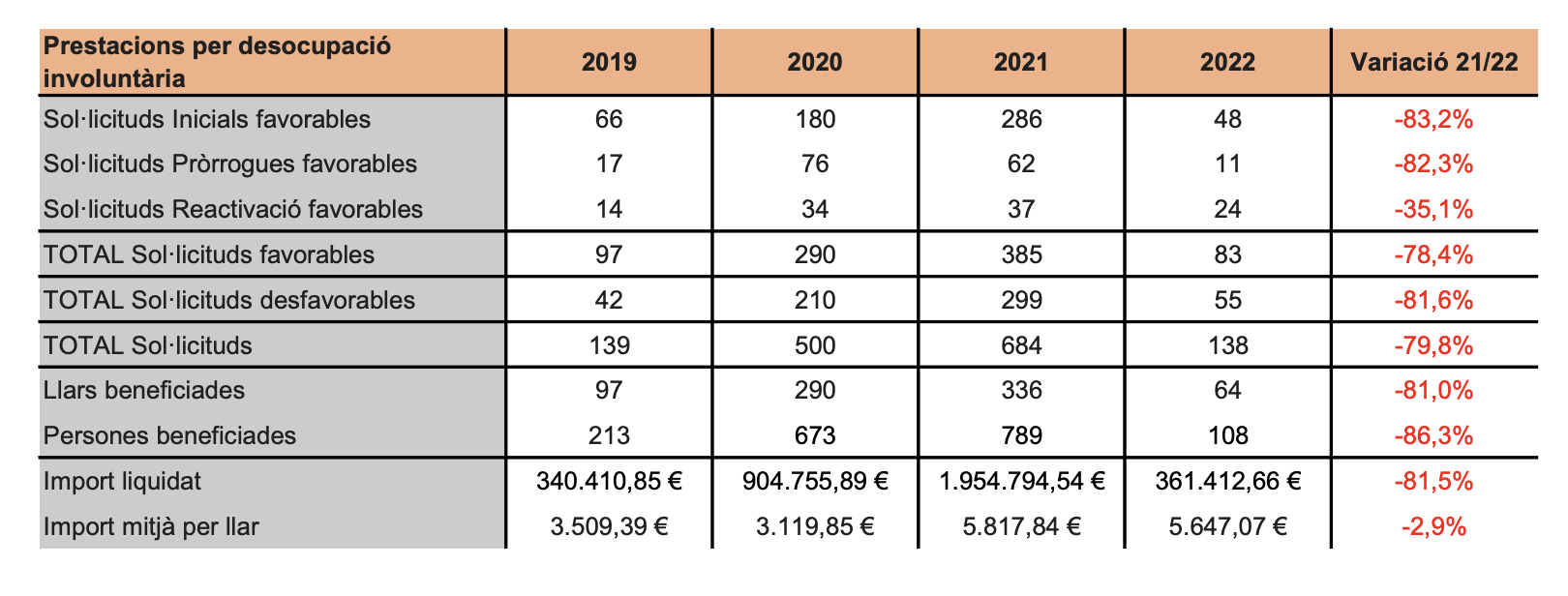 Aquesta xifra és la més baixa, amb molta diferència, del darrer lustre. Certament, les moltes persones que almenys temporalment es van quedar sense feina durant la pandèmia va fer disparar la xifra de persones concretes que van rebre aquest tipus de prestacions fins a 673 el 2020 i 789 el 2021. Evidentment, al 2019 hi va haver moltes menys prestacions atorgades d’aquesta modalitat (213), però van quedar també per sobre de les del 2022.