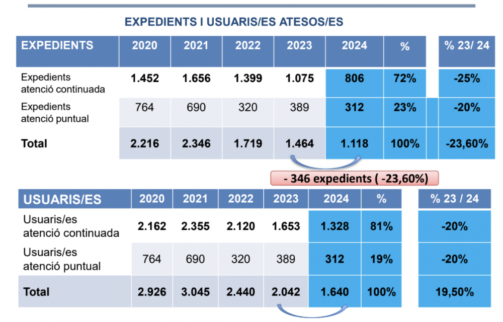 Els expedients totals oberts ha estat un 23,60% menys que l’any anterior, passant de 1.464 a 1.118. En xifres absolutes, això suposa 346 expedients menys. D’aquests, els relacionats amb l’atenció continuada suposen el 72%, i durant el 2024 n’hi va haver 806, un 25% menys que l’any anterior. Pel que fa als d’atenció puntual, n’hi va haver 312, un 20% menys que el 2023 (389). Quant als usuaris, hi ha hagut un 19,50% menys, passant de 2.042 a 1.640 persones.