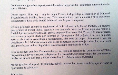 El mail que els funcionaris han trobat de bon matí els comunicava -era un recordatori, més aviat- que divendres havia comunicat la seva dimissió com a ministre d’una cartera que des de principi d’any havia incorporat sota el seu aixopluc la secretaria d’Estat de la Funció Pública. Més enllà de mostrar “l’honor i el privilegi” d’encapçalar durant un any i mig el ministeri que ara deixa i d’agrair “el suport i la confiança rebuda de totes les persones amb les qui he tingut l’oportunitat de col·laborar”, el polític i economista canillenc també fa un repàs a “un dels projectes en curs”.