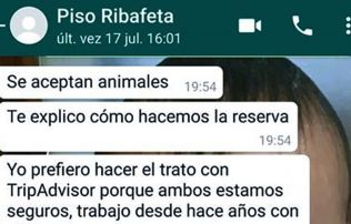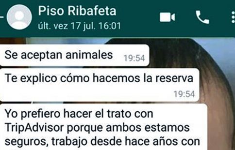 En canvi, però, sí que es pot fer una reserva. Després d’una primera conversa a través del canal que ofereix la pròpia web, per quedar al marge del control d’aquestes pàgines, l’interlocutor oferent convida a continuar negociant la qüestió a través del whatsApp. Llavors es proposa fer un dipòsit a través d’un compte de TrypAdvisor que, teòricament, reté la fiança fins que no es rebin les claus del pis. Evidentment, però, el més calent acaba estant a l’aigüera.