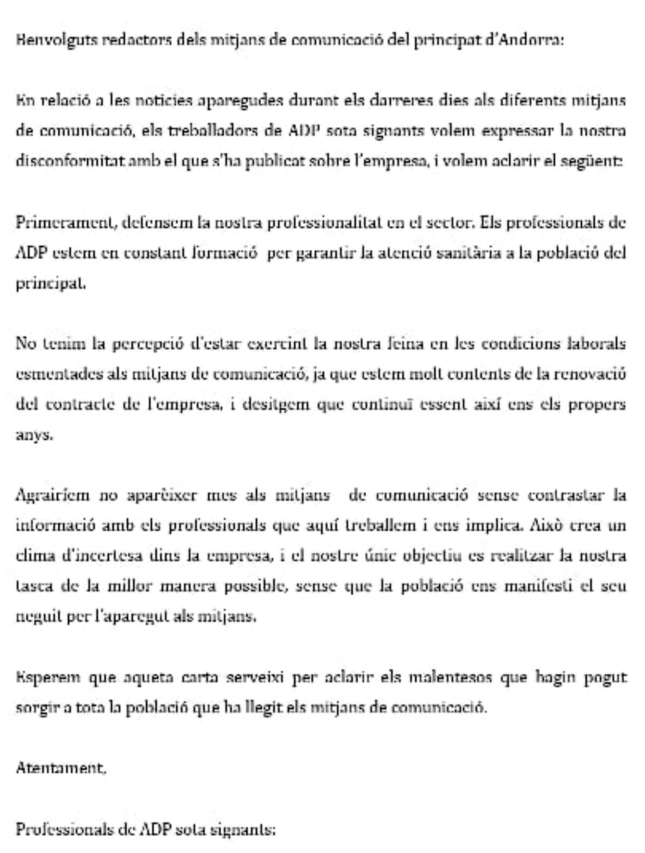 Alguns dels comandaments d’ADP, especialment Mumbardó, encarregat, i a suposada proposta espontània d’un recent incorporat treballador, haurien estat els responsables d’impulsar l’escrit, que han demanat que sigui secundat i firmat pels treballadors. Amb noms, cognoms i document identificatiu. Bona part del personal hauria signat el document, “però sabent molts d’ells que el que s’hi diu no és cert però sent conscients que no firmar pot comportar represàlies”, segons fonts sindicals i d’altres de coneixedores de la situació de l’empresa. És habitual, segons les fonts, que la direcció d’ADP premiï els fidels, els acòlits, mentre atorga els pitjors horaris i els serveis menys remunerats a aquells que són més crítics.