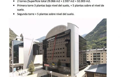 Fa encara no dos mesos, una empresa de la Catalunya central dedicada a la promoció immobiliària i també de les energies renovables exposava en la seva cartera de productes l’edifici d’Andbank. Destacant que es tractava d’una firma amb rentabilitat triple AAA, s’explicaven algunes de les característiques de l’immoble i s’apuntaven algunes condicions de l’operació tal i com es pot observar en la imatge adjunta. Així, es ressaltava directament el fet que es tracta de la seu social del banc Andbank a Andorra. I que l’immoble està dividit en dues torres amb una superfície total de més de 32.000 metres quadrats. S’explica que la primera torre està integrada per tres plantes sota el nivell del sòl i cinc plantes damunt d’aquell nivell. La segona torre disposa només de les plantes superiors. S’ofereix un contracte d’obligat compliment de vint anys i una rentabilitat del 7%. El preu de venda, segons l’anunci de la Plataforma Generem lligada a Solnet2000, era de 75 milions d’euros.