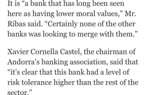 Su querido hijo Oriol en The New York Times, lanzó lindezas como estas: "It is a bank that has long been seen here as having lower moral values,” Mr. Ribas said. “Certainly none of the other banks was looking to merge with them".