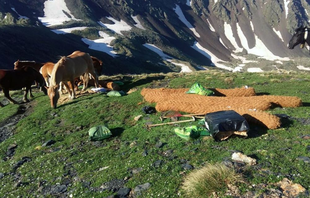 Sense anar més lluny aquest cap de setmana, cavalls i pollins s’alimenten d’una mena de llavors que hi ha al cim i que serveixen per replantar l’herba. De fet, és el mateix producte, segons indiquen les fonts, que utilitzen les societats explotadores de les estacions d’esquí quan han de restituir un terreny que prèviament han hagut de malmetre per alguna cosa. Quan han de regenerar una zona afectada per un moviment ‘antinatural’ de terres. Per exemple, un indret on s’hi ha de fer una rasa per fer-hi passar uns tubs enmig de les pistes.