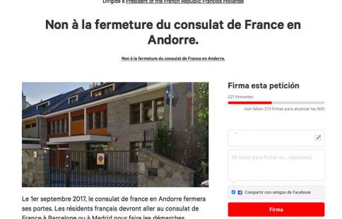 La plataforma virtual change.org cada cop es prodiga més a registrar accions relacionades amb Andorra. La darrera, una recollida de signatures dirigida al president de la República francesa i Copríncep d’Andorra, François Hollande, reclamant-li que faci els passos necessaris per evitar el tancament del consolat de França al Principat.