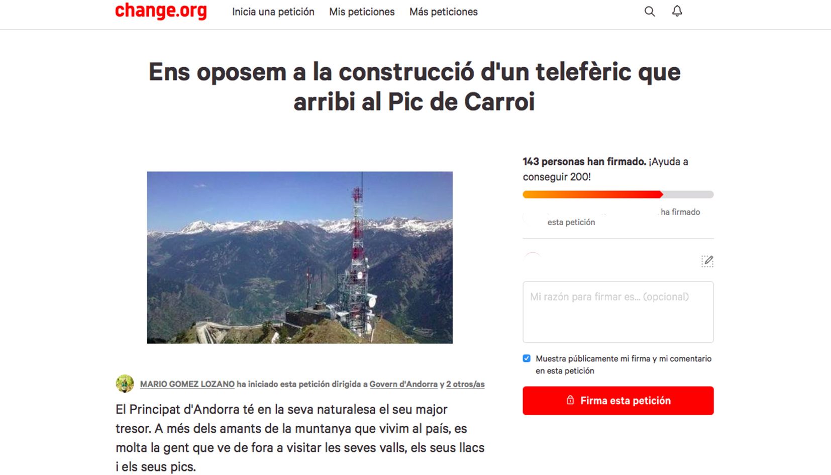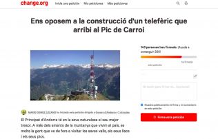 En aquest marc acaben recordant que “per a molts no té sentit i creiem que el que realment impulsa a tirar endavant aquesta obra, és l'interès econòmic d'uns pocs”, tot sol·licitant finalment que s’ajudi “amb la teva signatura a fer-los saber”, s’entén principalment a les tres administracions que formen part de la comissió que elabora el plec de bases i a la qual es dirigeix la iniciativa via ‘change.org', que “no som només quatre amants de la muntanya els que ens oposem a aquesta obra absurda”.