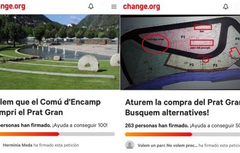 Totes dues campanyes són una clara reacció ciutadana a una reunió informativa, la de dimecres, que lluny de suposar un bany de masses per al cònsol -efecte que inicialment es va pretendre fent circular entre mares d’infants de la parròquia un whatsApp quan ni tan sols s’havia convocat la reunió de pobles-, va acabar generant molts dubtes. Moltes ombres i pocs llums. Fins i tot deixant entreveure una operació immobiliària poc clara per afavorir uns privats concrets. En tot cas, hi ha detractors i també hi ha clars defensors de l’operació. Els primers han iniciat la campanya a change.org i hores d’ara haurien recollit uns tres-cents suports. La reacció dels segons no s’ha fet esperar i hores després hi havia una segona campanya en marxa, la partidària de la compra.