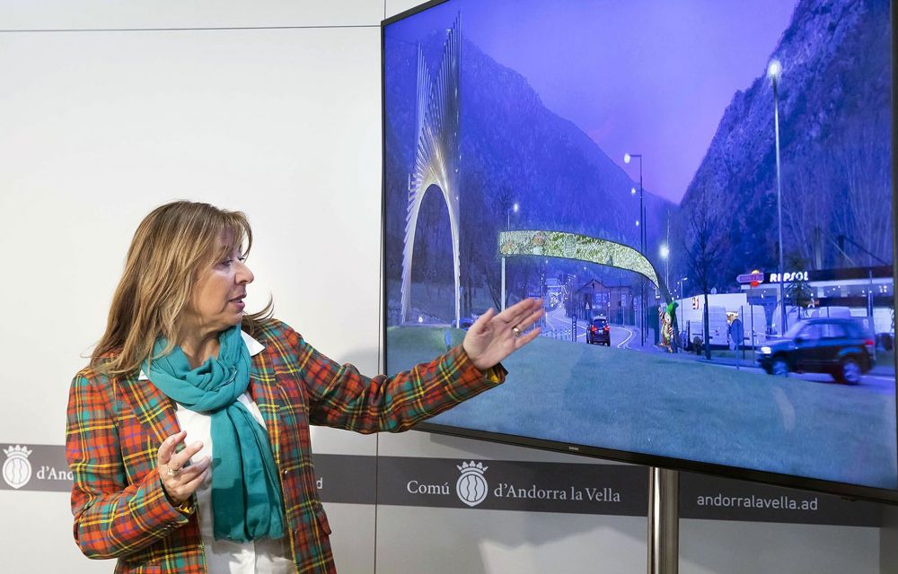 La cònsol major, Conxita Marsol, ha presentat el projecte guanyador del concurs nacional d’idees per a la creació d’un portal d’entrada a la parròquia d’Andorra la Vella a la rotonda de la Margineda amb l’objectiu de fomentar el flux de vehicles per l’avinguda d’Enclar. Ho ha fet acompanyada d’Adserà, encarregat de desenvolupar el projecte. Durant l’estiu, s’instal·larà un portal d’entrada de 30 metres de llargada i 9 d’alçada que pretén captar l’atenció dels conductors i prioritzar que els vehicles en direcció a la capital, a l’encreuament de la rotonda de La Margineda, accedeixin per l’avinguda d’Enclar.