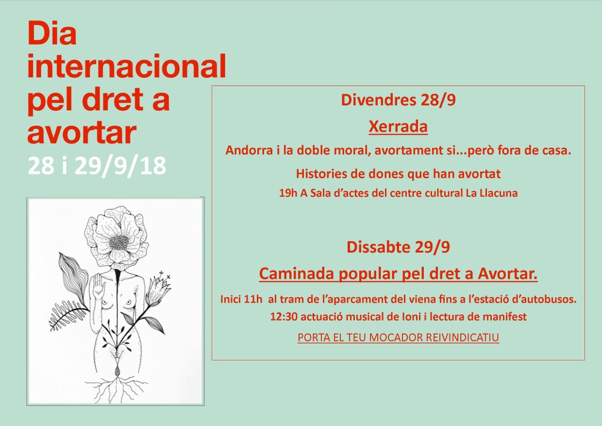 La iniciativa, que a les xarxes socials està agafant molta volada i en què els missatges denunciant la situació de l'avortament a Andorra ja es compten a desenes i fins i tot algun centenar, es du a terme tota aquesta jornada de dilluns. Però s'han organitzat altres activitats per als dies 28 i 29 de setembre aprofitant que el primer d'ells està assenyalat com el Dia internacional pel dret a avortar i el segon s'escau en un dissabte. El dia 28, a la sala d'actes del Centre Cultural La Llacuna d'Andorra la Vella s'ha programat, a partir de les 7 de la tarda, una xerrada intitulada 'Andorra i la doble moral, avortament sí... però fora de casa' que pretén recollir tot un seguit d'històries de dones que han avortat. I el 29 de setembre s'ha programat una caminada reivindicativa entre l'aparcament del Viena, a Santa Coloma, i fins a l'estació nacional d'autobusos, on hi haurà una actuació musical i la lectura d'un manifest.