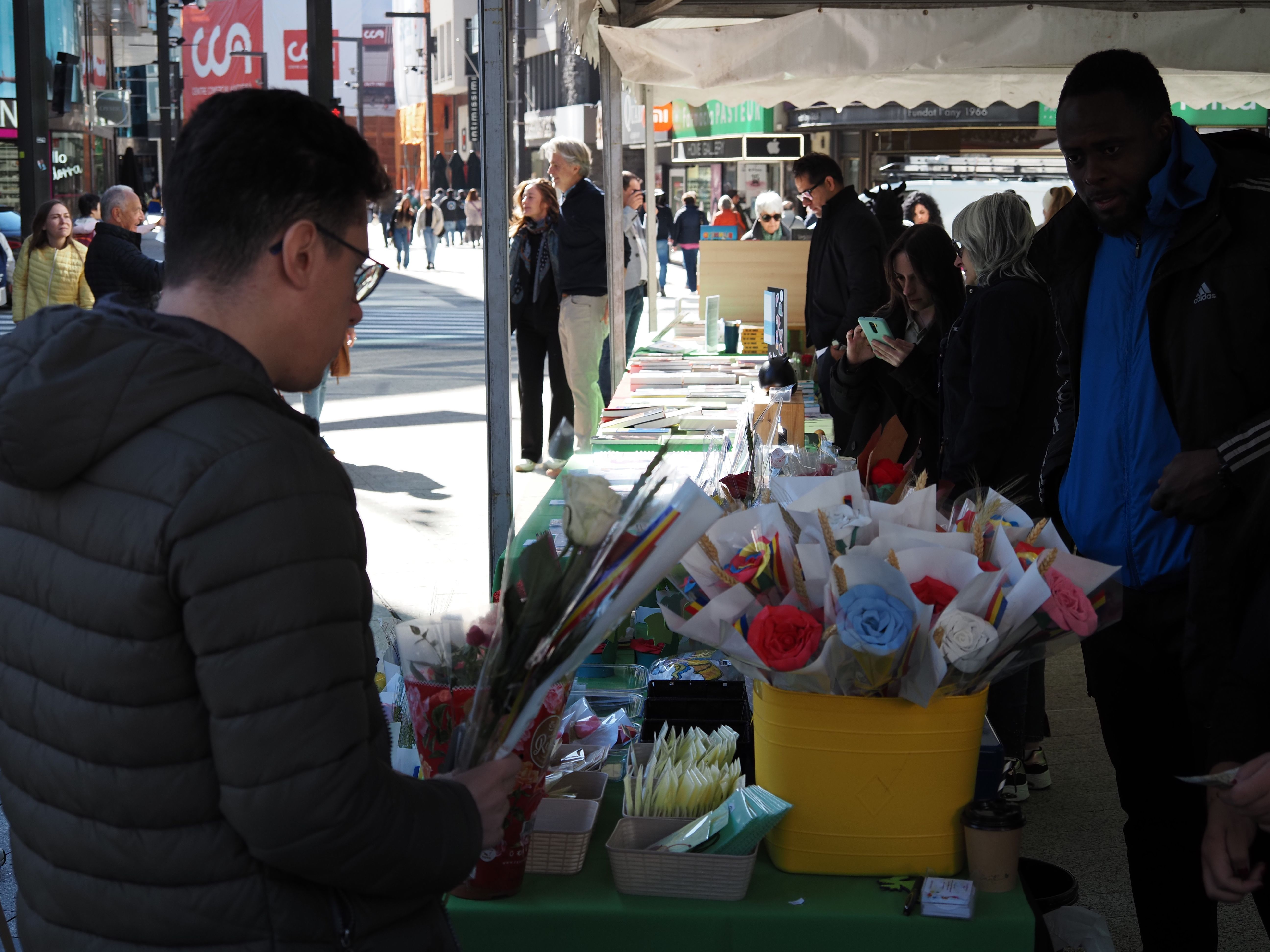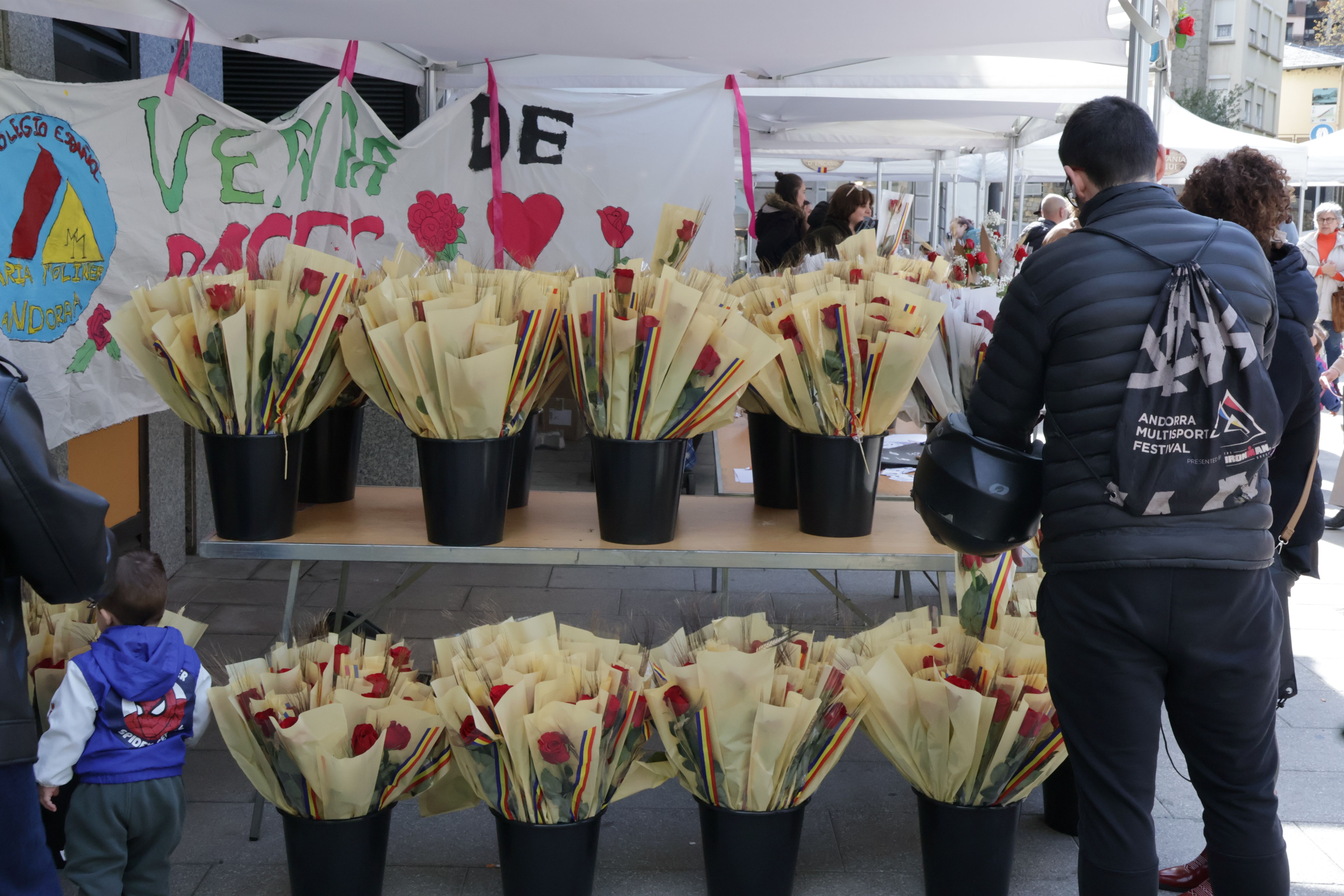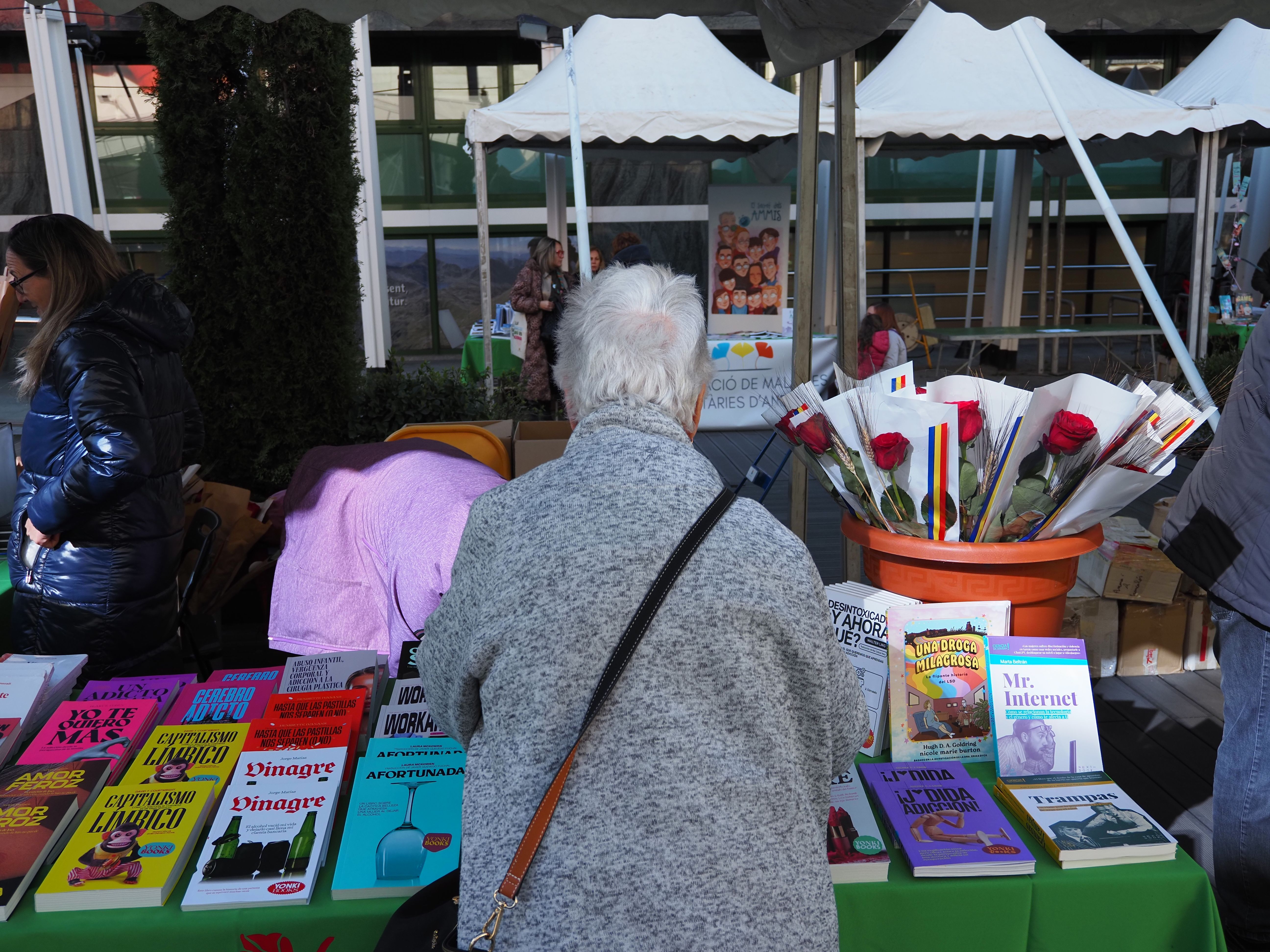 El centre neuràlgic del Sant Jordi escaldenc ha estat la plaça Coprínceps, on s’han instal·lat les parades de roses i llibres. S’han vist roses de tota mena: naturals, ben roges, és clar, però també de pastisseria, fetes amb peces de Lego o elaborades amb càpsules de cafè reciclades... Pel que fa a la part literària, tant o més important que la floral, han disposat parades les llibreries La Trenca i Moby Dick o, també, la Biblioteca Comunal d’Escaldes-Engordany (amb volums de segona mà). L’ambient s’ha anat animant des de les onze del matí. Les criatures han pogut passar el matí participant en diferents tallers de creació i enginy.