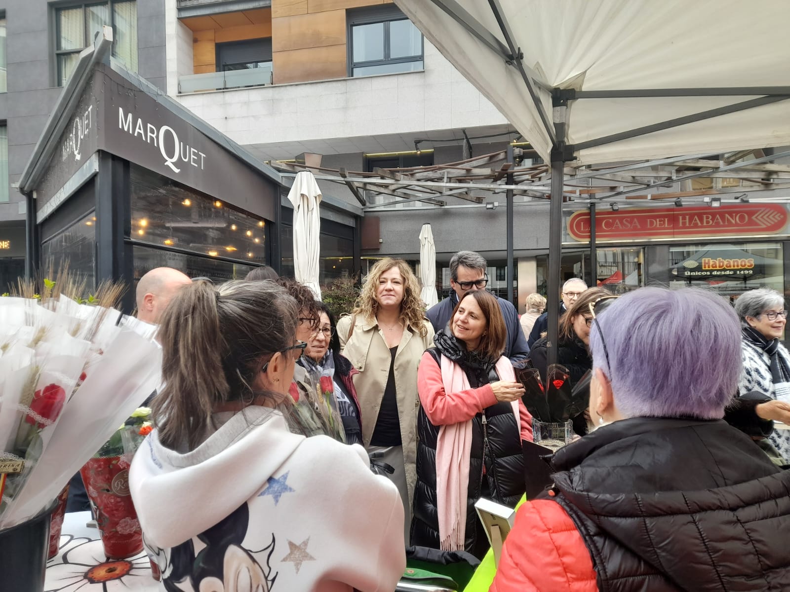 Rosa Gili i altres consellers conversen amb les paradistes a la plaça Coprínceps.