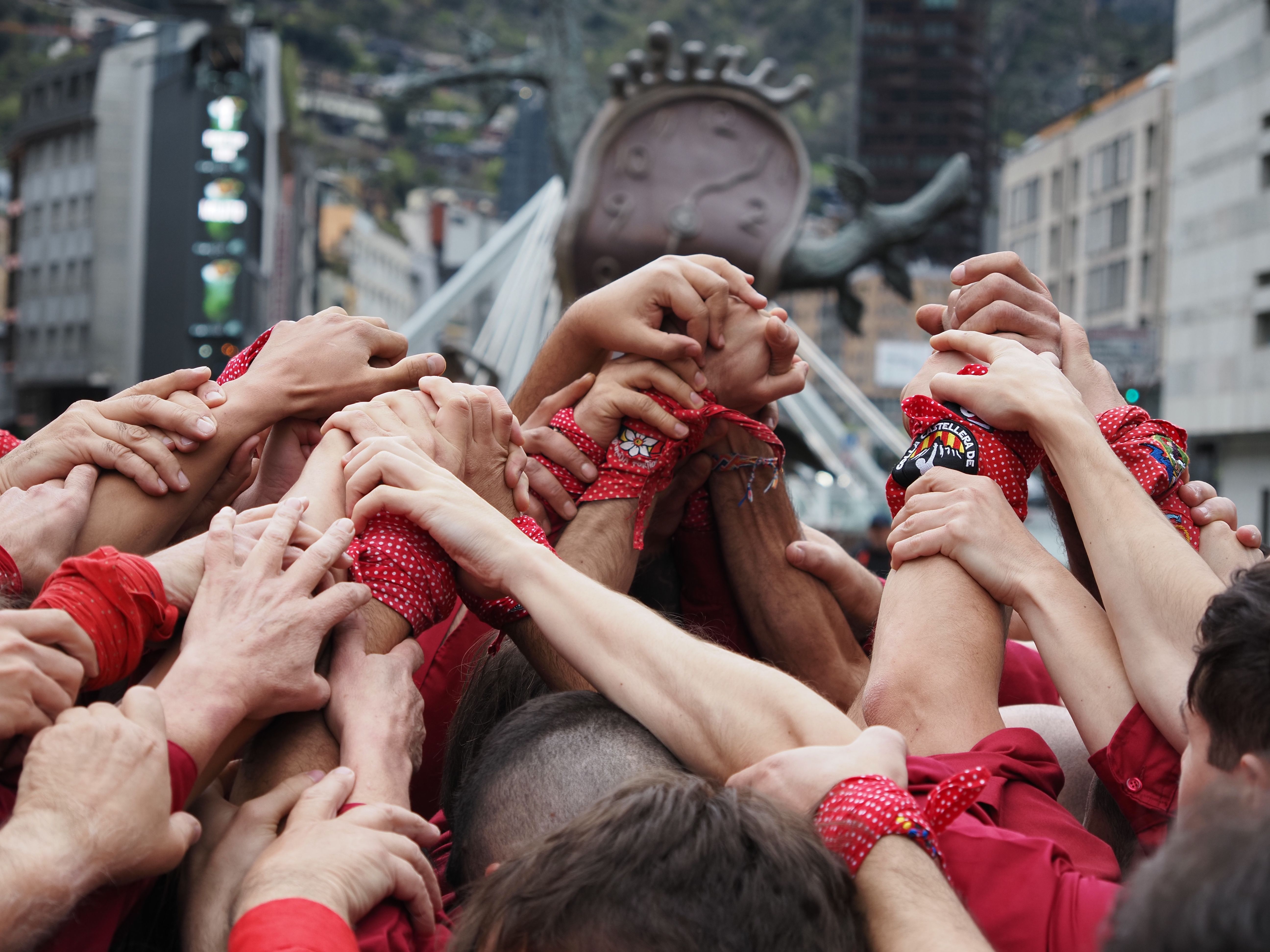 Les mans dels Castellers d'Andorra fent pinya.