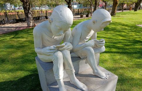 L’escultura, feta de resina i pols de marbre, va ser la guanyadora del primer concurs d’art urbà que va organitzar el comú d’Andorra la Vella el 2023. I amb dos infants asseguts de costat, però sense mirar-se, i pendents només dels mòbils, vol fer reflexionar sobre els riscos del mal ús de la tecnologia i l’addicció al mòbil.