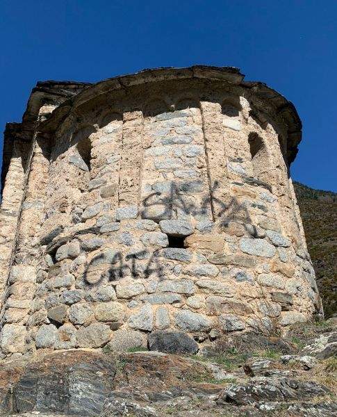 Per sort o per desgràcia, els únics grafits que s’han fet són les dues paraules localitzades a l’absis. Les dues institucions -comú i Govern- han formulat la corresponent denúncia a la policia i treballen per a l’eliminació d’aquest deplorable acte contra el patrimoni cultural. Amb la voluntat de restaurar el patrimoni cultural en el seu estat original, els equips del comú i el Govern treballaran aquest dimarts perquè no quedin restes de l’acte vandàlic.