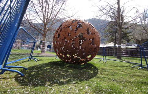 Tot i estar ja col·locada, tot és encara provisional i se’n guarden els detalls. Gaset, Judit, és la protagonista de la primera exposició temporal que es farà al Centre d’Art. La inauguració serà ben aviat. La mostra és una mena de retrospectiva de l’artista. Es tracta de veure la seva evolució. Gaset, per tant, serà protagonista dins i fora, on ja es pot observar, entre tanques comunals, una esfera composada per algunes desenes de fulles d’arbre fetes amb acer Corten.