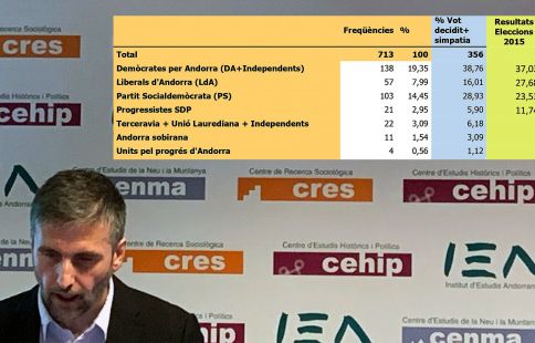 Demòcrates per Andorra (DA) es manté, socialdemòcrates pugen, liberals i SDP reculen, terceravia probablement s’estrenaria al Consell General i Eusebi Nomen i Alfons Clavera se’n quedarien fora. Aquesta és una possible lectura dels resultats de l’enquesta preelectoral fets públics aquest matí pel Centre de Recerca Sociològica (CRES). La lectura se centra en la circumscripció nacional, en què els taronges tornarien a ser la formació més votada i podrien arribar a obtenir sis escons. La composició final del parlament, però, dependrà, com gairebé sempre, de les parroquials. I aquí el CRES no hi entra tot i que sí que augura que hi haurà més competència de la que hi ha hagut en altres conteses electorals.