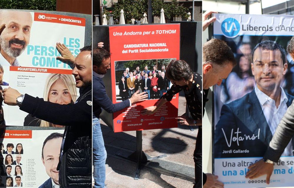 Els partits ‘més petits’ o de recent creació, com l’esmentat UPA o Andorra Sobirana, que com a mínim en el cartell de la llista nacional, almenys els ja mostrats fins ara, no hi apareix la fotografia de cap candidat però sí que es remarca, com s’ha dit, el fet que excepte aquesta formació liderada per Nomen tota la resta -la d’Alfons Clavera es deixa al marge, també- està a favor, d’una manera o una altra, amb un acord d’associació amb la Unió Europea (UE), han limitat molt els seus punts de penjada pública de cartells. Dos o tres indrets i ja està. En canvi, la resta de formacions hauran estat entre cinc i sis hores rodant pel país fent les primeres aparicions públiques i aprofitant l’ocasió per demanar ja obertament el vot.