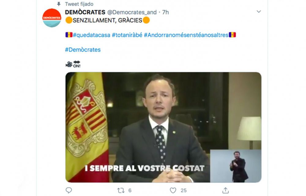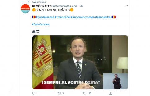 Amb imatges només de dirigents de la formació taronja intercalades entre d’altres de carrers buits, cotxes aturats o cossos de seguretat i salvament fent la seva feina -fins i tot els agents de circulació del comú d’Escaldes, de majoria socialdemòcrata, ballant a l’avinguda Carlemany-, el muntatge es fa ressò del tancament global que s’ha decidit per aturar la propagació de la pandèmia o del fet que són els demòcrates els que estan al peu del canó.