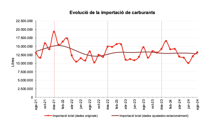 La importació de carburants durant el mes d’agost ha estat de 13,28 milions de litres, fet que suposa una variació percentual negativa del 10,0% respecte al mes d’agost de l’any anterior. Aquest mes el Fuel domèstic presenta una variació positiva del 2,8%, mentre que la Gasolina sense plom i el Gasoil de locomoció presenten variacions negatives del 4,9% i del 14,0%, respectivament.