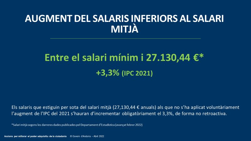 Però la situació generada arran de l’esclat de la guerra a Ucraïna no afecta només la classe baixa. També impacta en la mitjana i, per això, una altra mesura, aquesta sota empara d’una llei específica, serà la d’obligar a incrementar (sempre que no es fes amb l’IPC del 2021 a inicis d’any) el salari d’unes 24.500 persones. Són les que cobren entre el mínim i els 27.130,44 euros bruts anuals (és a dir, el sou mitjà). En aquest cas, un 3,3%.