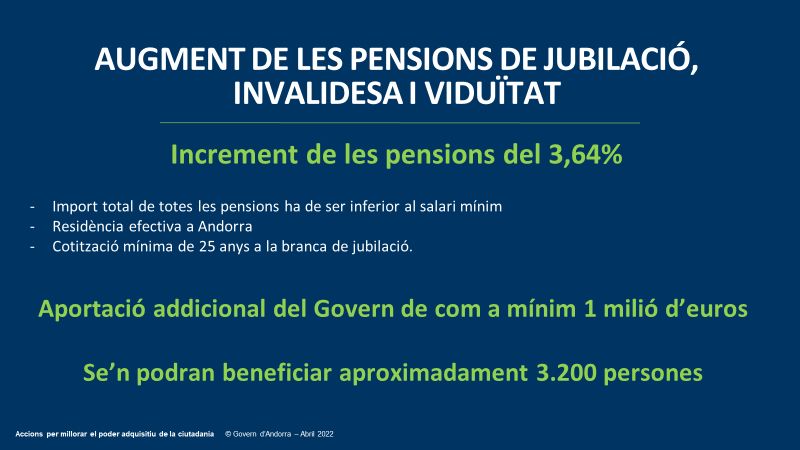 Salaris a banda, Govern també aposta per incrementar les pensions contributives (jubilació, invalidesa o viduïtat). En aquest cas, un 3,64% sempre que la persona beneficiària resideixi efectivament a Andorra, hagi acumulat 25 anys, com a mínim, de cotització i que les actuals siguin inferior al sou mínim. La carrega en despesa d’aquesta mesura no l’assumirà la CASS, sinó el mateix executiu. “No volem carregar més la branca de jubilació”, ha apuntat Espot. S’estima que això suposarà un cost d’un milió d’euros i afectarà 3.200 persones.