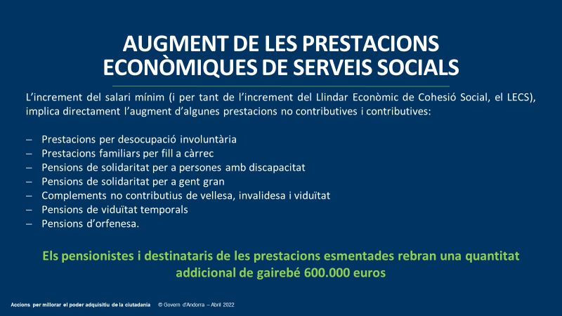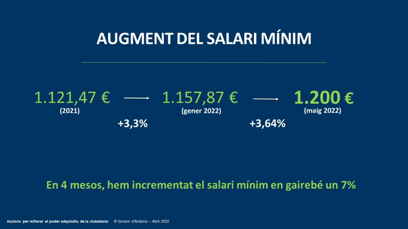 La mesura estrella és, sense cap mena de dubte, una que ja havia apuntat dijous passat, al Consell General, el mateix Espot: un increment de les remuneracions dels treballadors. I no només aquells que més cobren. A aquests, els qui perceben el salari mínim, se’ls tornarà a apujar. Un 3,64%, que fa que passi dels 1.157,87 euros bruts al mes a assolir “la xifra psicològica” dels 1.200. “En quatre mesos”, ha destacat el cap de Govern, haurà crescut un 7%. Aquesta mesura serà automàtica a partir de l’1 de març, ja que es pot establir via decret, i també afectarà altres prestacions, com ara les de desocupació involuntària, per fill a càrrec o les pensions de solidaritat. El cost per a l’executiu s’estima en 600.000 euros.