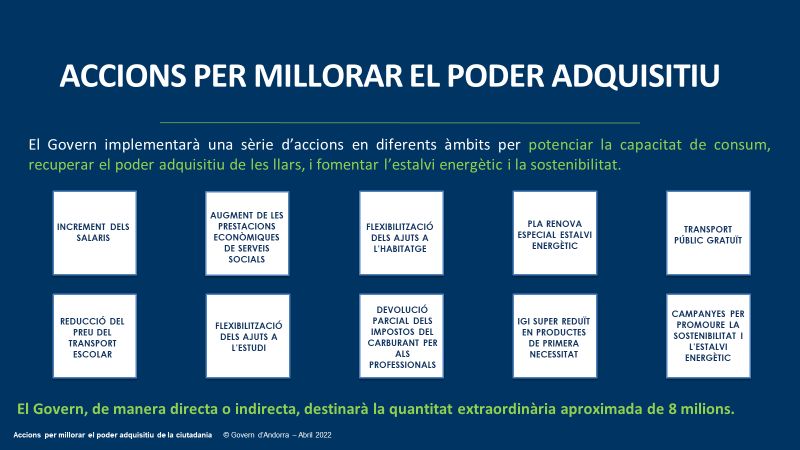 Les mesures, “transversals” segons que ha explicat el cap de Govern, Xavier Espot, s’han anunciat aquesta tarda al consell econòmic i social, on hi són representats els agents econòmics, siguin patronals o sindicals. Se’ls ha demanat valoració i, també, que facin aportacions, ja sigui sobre les ja plantejades o sobre noves accions que considerin que es puguin implementar. La voluntat és que en poques setmanes es pugui assolir un paquet ja definitiu que ajudi, en paraules del mandatari, a “millorar decididament el poder adquisitiu de la ciutadania i, en particular. de les persones amb rendes més baixes i més risc d’exclusió social”. En global, un paquet que per a l’Estat es calcula que suposarà una despesa de vuit milions d’euros.