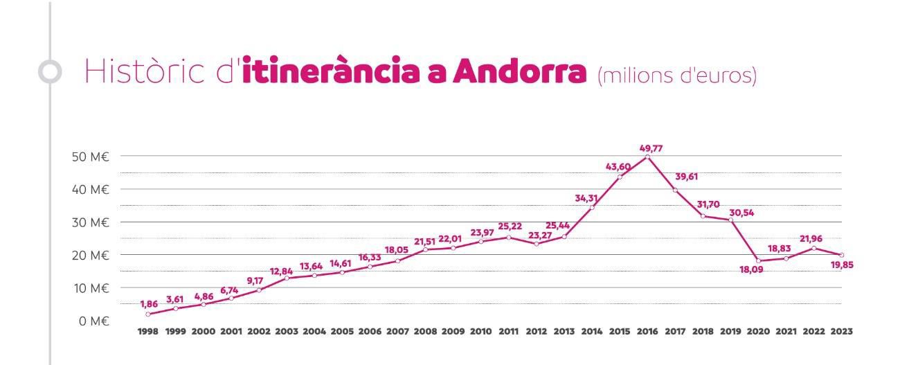 El primer contracte signat per la companyia va ser el 1998 i “molt ràpidament ja era rellevant als comptes de l’operadora”, remarca el seu director. I és aquí on facilita un històric de la facturació que, per aquest concepte, s’ha anat fent any rere any. En aquests 25, fins al 2023, s’arriba a 551,39 milions d’euros.