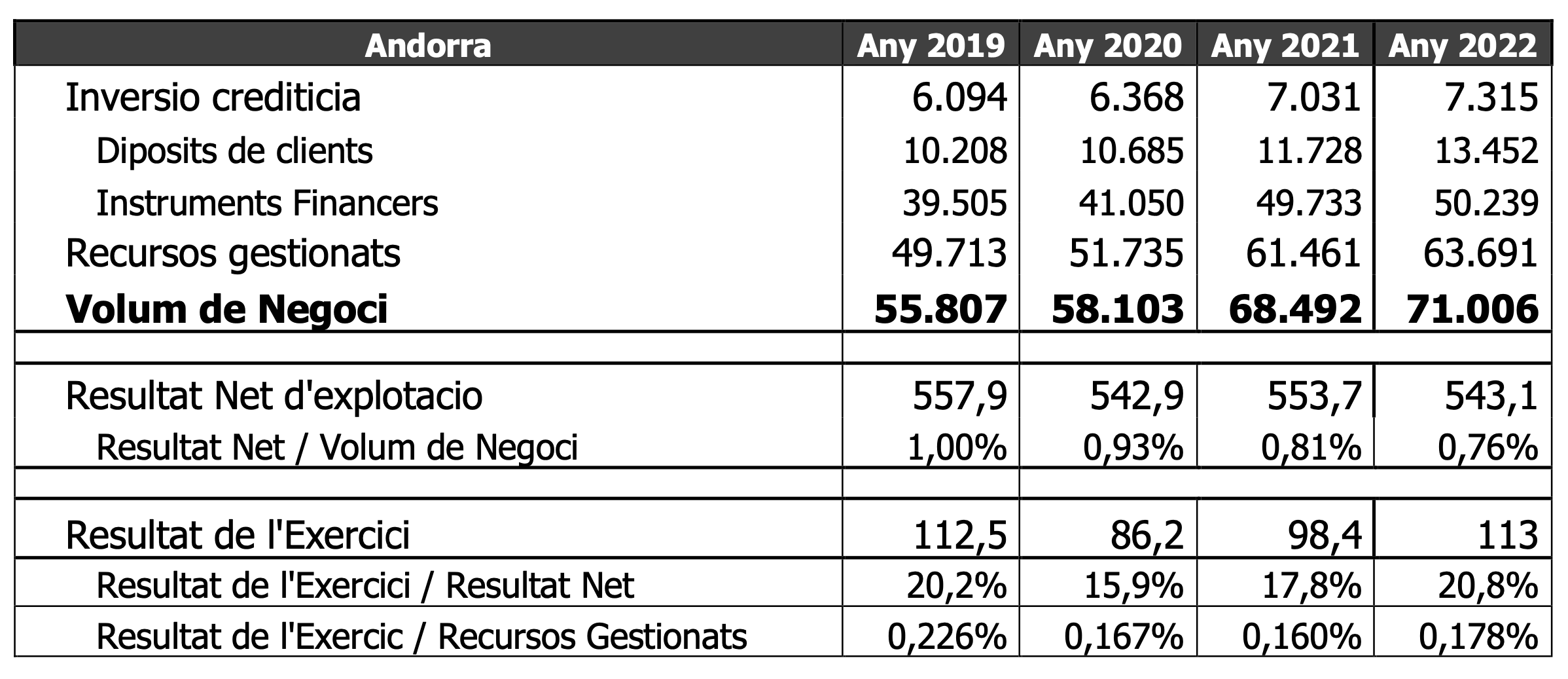 L’anàlisi dels darrers quatre anys continua reportant que per molt que la banca andorrana hagi incrementat el volum de negoci, i ho ha fet, el resultat d’explotació no sempre acompanya. Actualment, el resultat net d’explotació queda per sota de l’1% respecte del volum de negoci, que ha anat escalant de 55.807 milions d’euros el 2019 fins als poc més de 71.000 global el darrer exercici. Passant per 58.103 milions del 2020 i 68.492 milions el 2021.