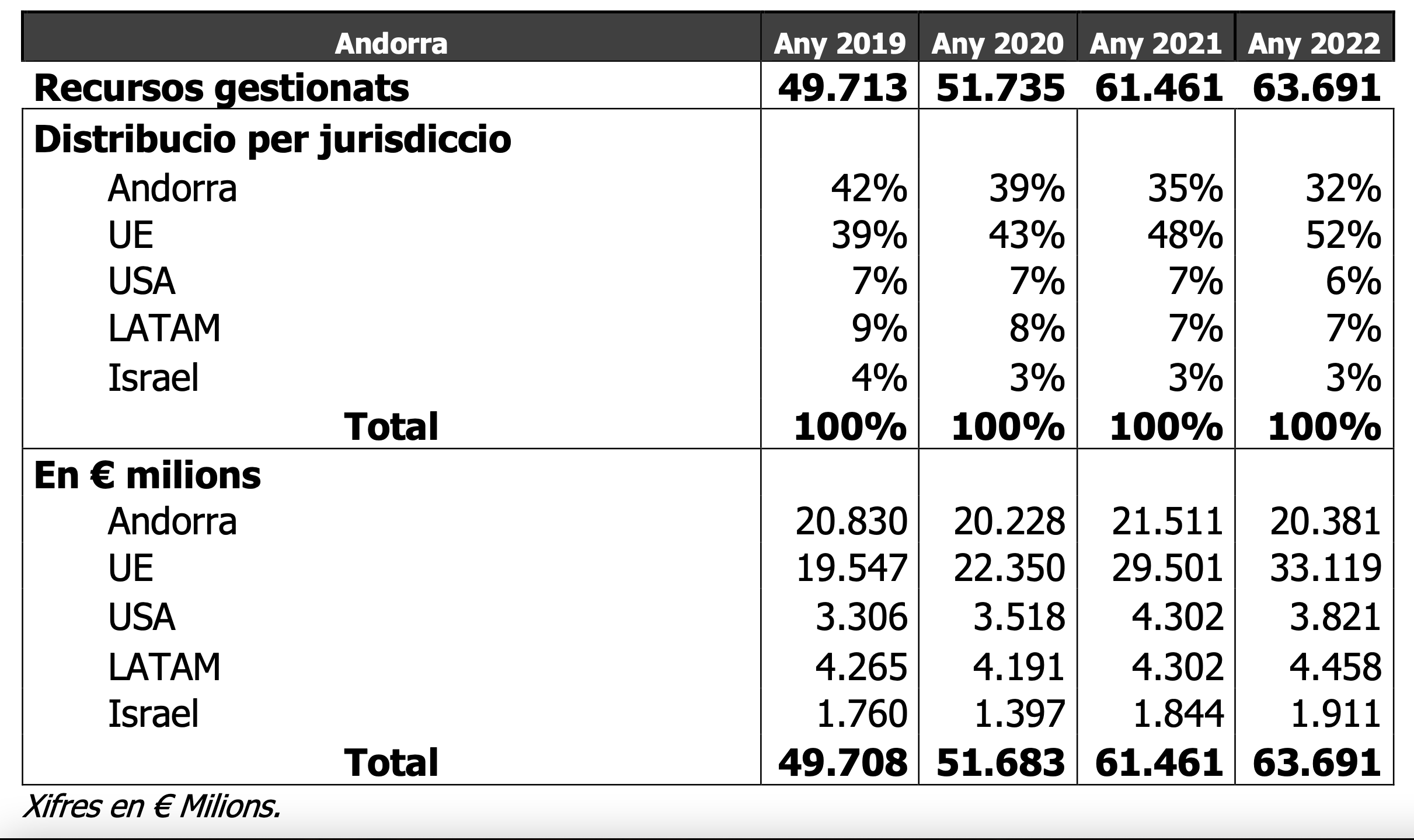 Des del 2020 que la banca andorrana, en global, gestiona més recursos en el conjunt de circumscripcions de la UE que no pas a Andorra. Però aquest 2022 la distància és molt gran. Hi ha a fora un 62% més de recursos que els que es gestionen al país. O en xifres absolutes, dels 63.691 milions d’euros que gestionava el conjunt de la banca andorrana l’exercici passat, 20.381 estaven en territori andorrà i 33.119 fora, a Europa. La resta passa a ser molt insignificant. 3.821 milions als Estats Units, 4.458 milions a Amèrica Llatina i 1.911 a Israel, on hi té un pas gairebé específic Andbank.