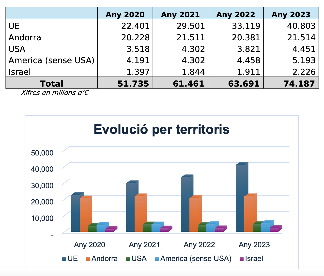Si aquests percentatges es traslladen a xifres absolutes, es podrà arribar a concloure que a final del 2023 la banca andorrana en el seu conjunt tenia recursos valorats en 40.803 milions d’euros dipositats en jurisdiccions UE mentre que a Andorra superava de poc els 21.500 milions. Als Estats Units els recursos gestionats assolien tot just els 4.451 milions d’euros superant el que es gestiona a Israel (2.226 milions) però quedant per sota del que la banca té dipositada a la resta del continent americà i molt sovint, gairebé sempre, a l’Amèrica Llatina (5.193 milions).
