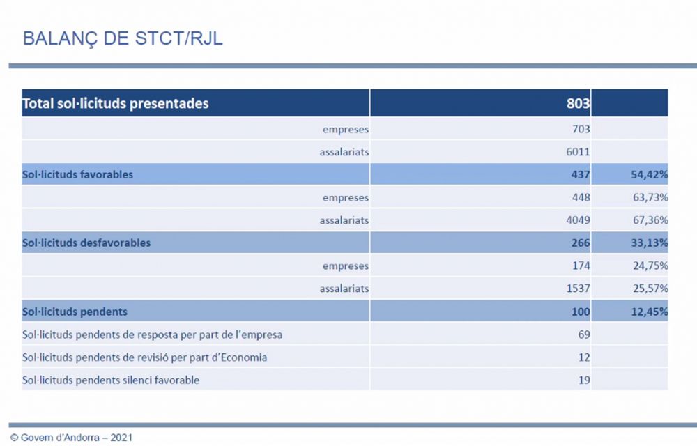 En global, des de l’1 de gener s’han presentat 803 sol·licituds formulades per un total de 703 empreses diferents i que afectaven 6.011 treballadors. D’aquestes, fins ara 266 han estat denegades (174 empreses per 1.537 assalariats) mentre que 437 -de 448 empreses i afectant 4.409 treballadors- han estat resoltes favorablement.
