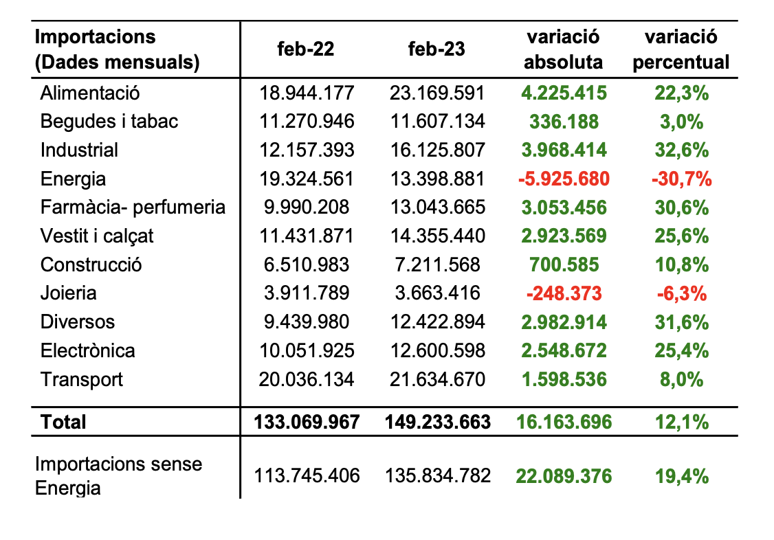 Les importacions durant el mes de febrer han sumat un valor de 149,23 milions d’euros, el que suposa una variació percentual del +12,1% respecte al febrer de l’any anterior. Això es degut a la variació percentual i absoluta positiva de gaire bé tots els grups, destacant alimentació amb un +22,3%, industrial amb un +32,6%, farmàcia i perfumeria amb un +30,6%, diversos amb un +31,6%, vestit i calçat amb un +25,6% i electrònica amb un +25,4%. Per contra, té una variació negativa destacada el grup energia amb un -30,7%.